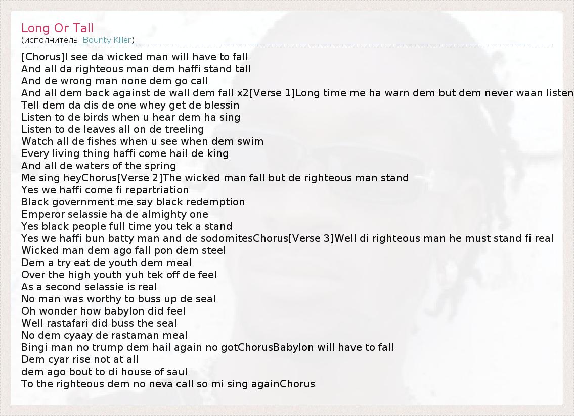Me sing heyChorus[Verse 2]The wicked man fall but de righteous man stand