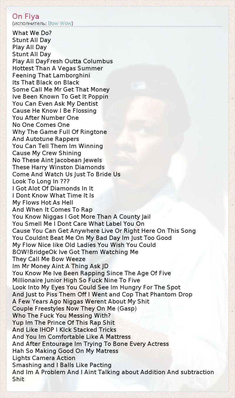 Это интересно:Shad Gregory Moss (родился 9 марта, 1987), больше известен под именем Bow Wow(ранее Lil’ Bow Wow), американский рэпер, актёр и музыкальный продюссер. sic producer. Свой первый альбом Beware of Dog выпустил когда ему было 13.Bow Wow – это принц хип-хопа нового тысячелетия. В своём штате он известен местным жителям за считку 16-ти последовательных тактов чистой рифмы, отчётливее и быстрее, чем рэпперы из старой и новой школы.... продолжение