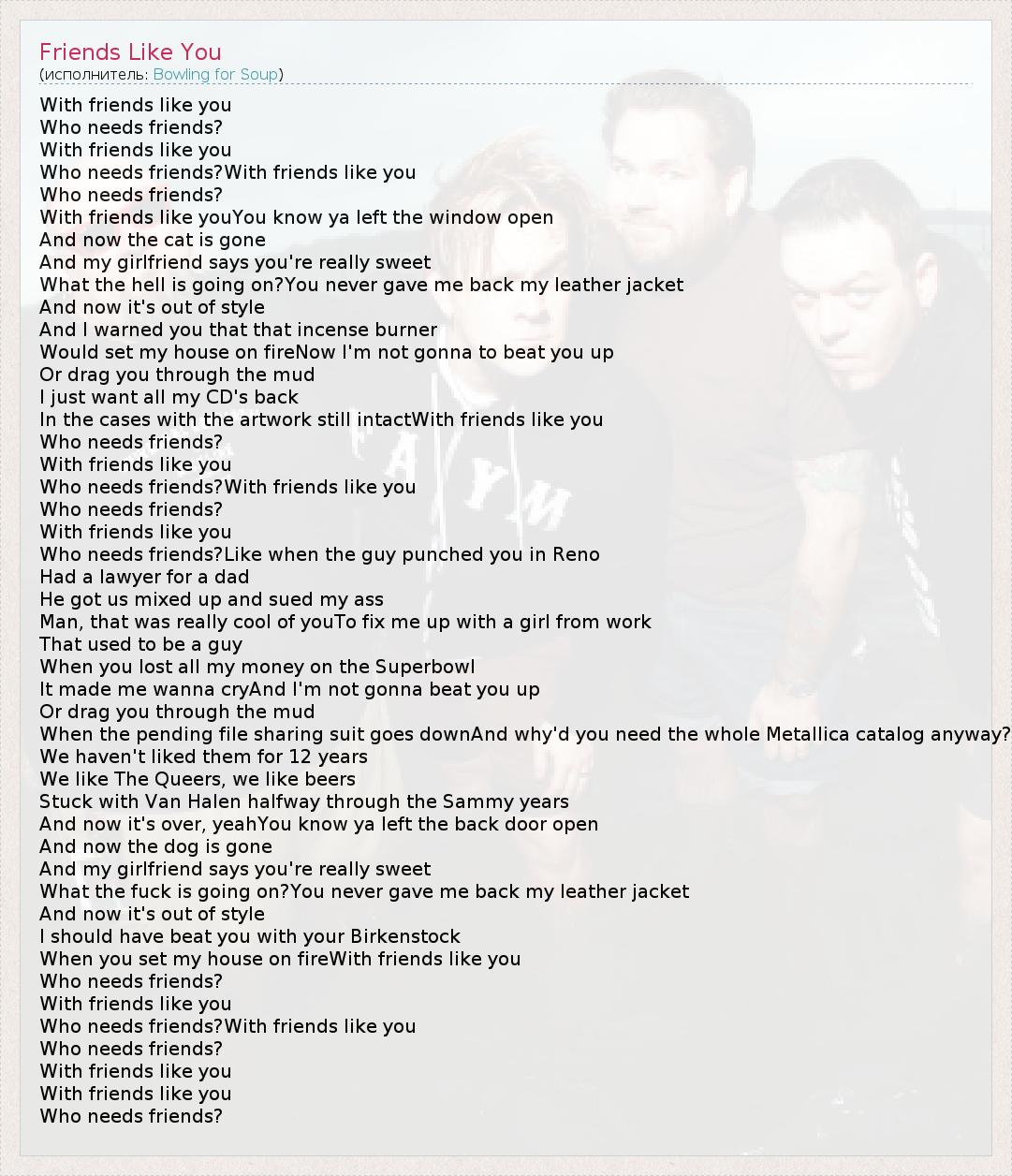 А как ты думаешь, о чем песня "Friends Like You" ?