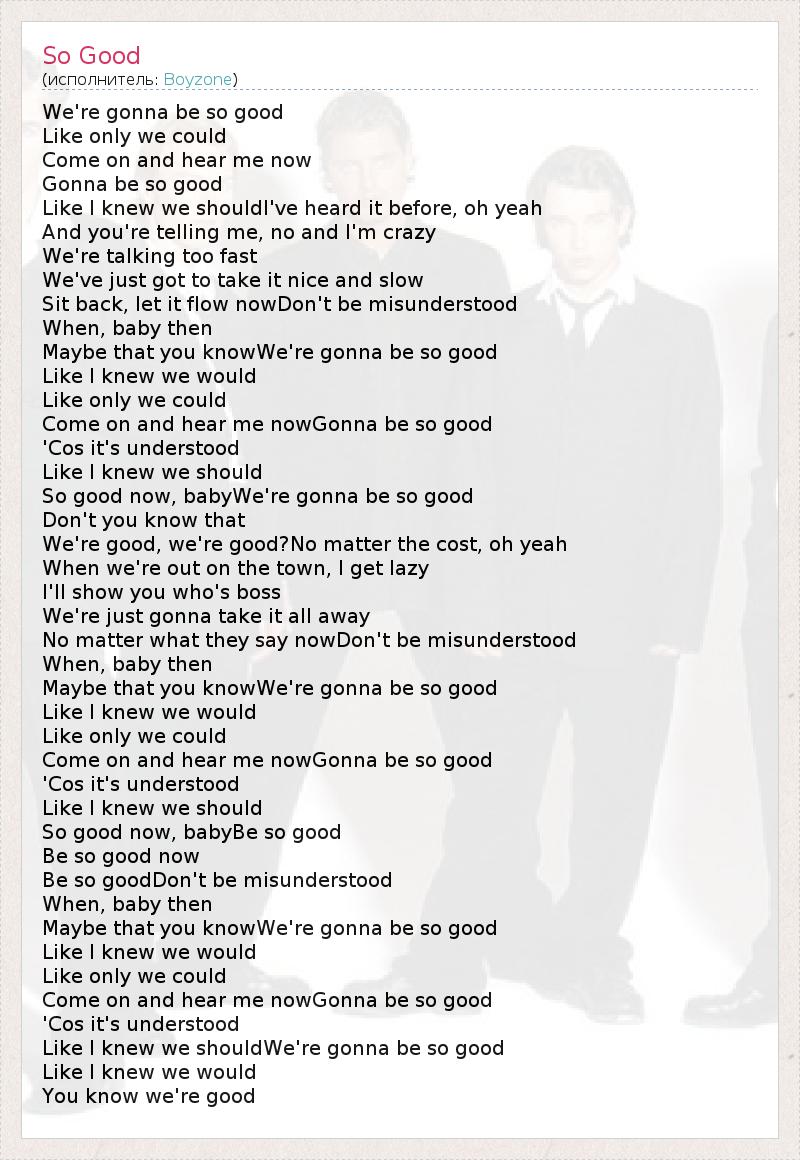 We're gonna be so good Like only we could Come on and hear me now Gonna be so good Like I knew we shouldI've heard it before, oh yeah And you're telling me, no and I'm crazy We're talking too fast We've just got to take it nice and slow Sit back, let it flow nowDon't be misunderstood When, baby then Maybe that you knowWe're gonna be so good Like I knew we would Like only we could Come on and hear me nowGonna be so good 'Cos it's understood Like I knew we should So good now, babyWe're gonna be so good Don't you know that We're good, we're good?No matter the cost, oh yeah When we're out on the town, I get lazy I'll show you who's boss We're just gonna take it all away No matter what they say nowDon't be misunderstood When, baby then Maybe that you knowWe're gonna be so good Like I knew we would Like only we could Come on and hear me nowGonna be so good 'Cos it's understood Like I knew we should So good now, babyBe so good Be so good now Be so goodDon't be misunderstood When, baby then Maybe that you knowWe're gonna be so good Like I knew we would Like only we could Come on and hear me nowGonna be so good 'Cos it's understood Like I knew we shouldWe're gonna be so good Like I knew we would You know we're good