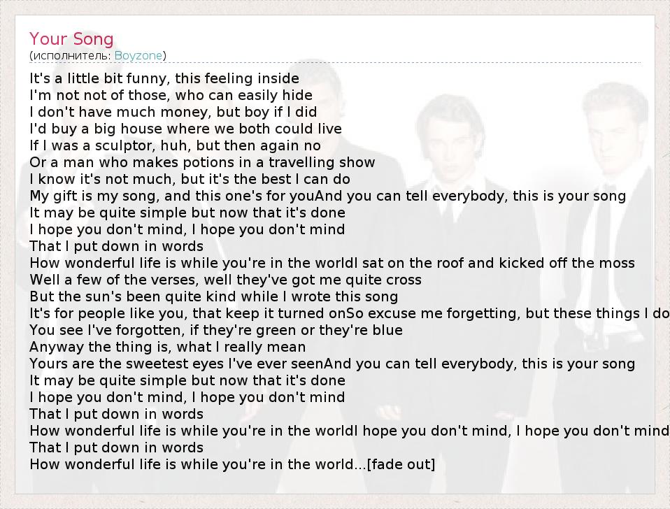 My gift is my song, and this one's for youAnd you can tell everybody, this is your song