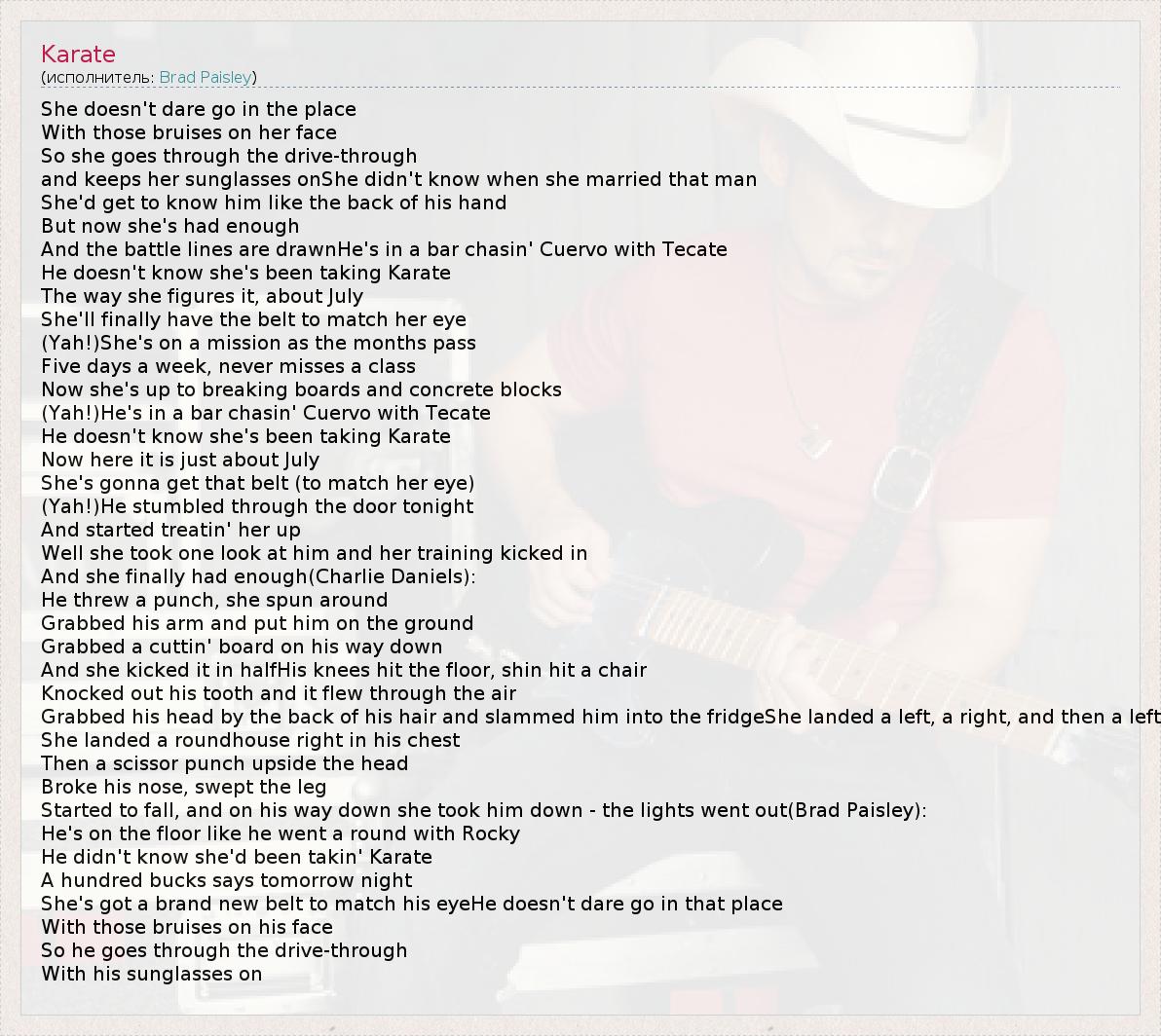 Это интересно:Родился 28 октября 1972 года в Глин Дейл, штат Виржиния, США. Еще с детства он обожал музыку в стиле кантри. Эту любовь ему привил его дедушка Уоррен Джарвис, который стал первым человеком поверившим в таланты юного мальчика. Когда Бреду исполнилось восемь, дед начал учить его игре на гитаре. А уже в двенадцать он написал свою первую песню. Когда Бреду Пейсли исполнилось тринадцать, он играл... продолжение