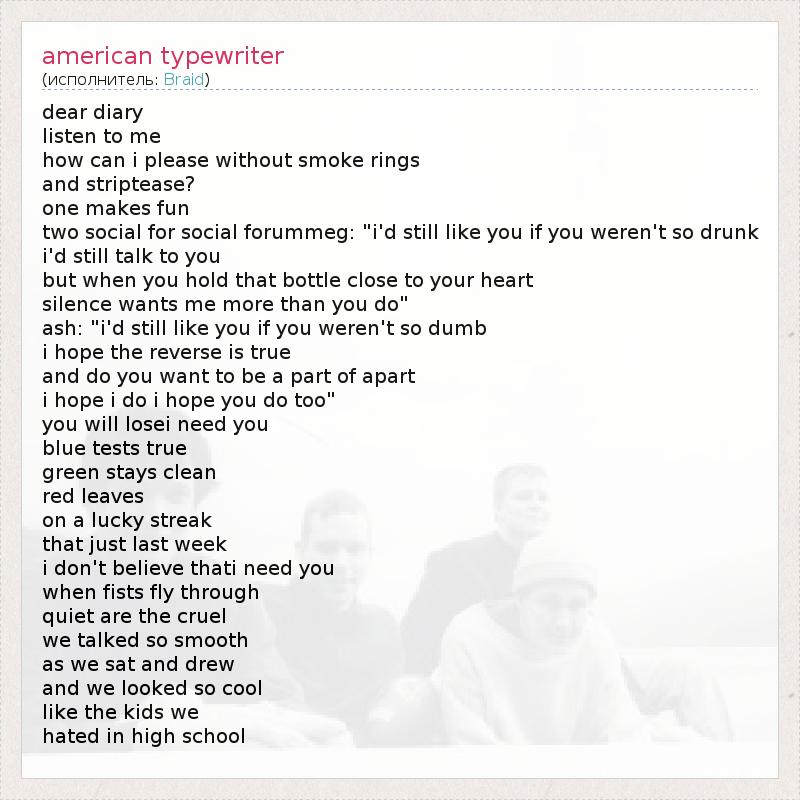 Это интересно:В 1993-ем году произошло самое большое музыкальное потрясение за всю историю многострадального города Урбан, штат Иллинойс. На свет появились известные Braid. У ребят дела не сразу пошли в гору: с начала существования состав неоднократно менялся. Но вскорости команда стала статичной: на место вокалиста/гитариста встал Bob Nanna, Chris Broach занял место гитариста/бэк вокалиста, Todd Bell cтал басистом,... продолжение