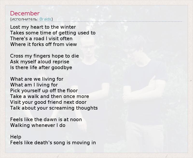 Lost my heart to the winter Takes some time of getting used to There's a road I visit often Where it forks off from view Cross my fingers hope to die Ask myself aloud reprise Is there life after goodbye What are we living for What am I living for Pick yourself up off the floor Take a walk and then once more Visit your good friend next door Talk about your screaming thoughts Feels like the dawn is at noon Walking whenever I do Help Feels like death's song is moving in