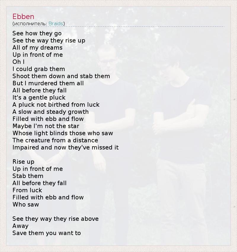 See how they go See the way they rise up All of my dreams Up in front of me Oh I I could grab them Shoot them down and stab them But I murdered them all All before they fall It's a gentle pluck A pluck not birthed from luck A slow and steady growth Filled with ebb and flow Maybe I'm not the star Whose light blinds those who saw The creature from a distance Impaired and now they've missed it Rise up Up in front of me Stab them All before they fall From luck Filled with ebb and flow Who saw See they way they rise above Away Save them you want to