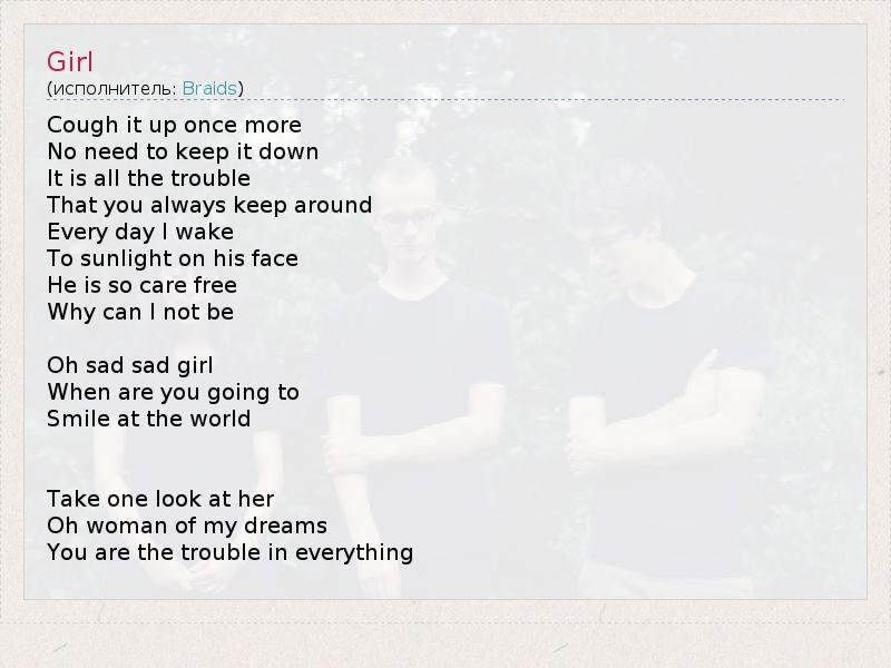 Cough it up once more No need to keep it down It is all the trouble That you always keep around Every day I wake To sunlight on his face He is so care free Why can I not be Oh sad sad girl When are you going to Smile at the world Take one look at her Oh woman of my dreams You are the trouble in everything