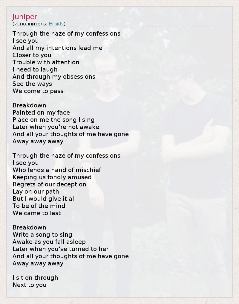 Through the haze of my confessions I see you And all my intentions lead me Closer to you Trouble with attention I need to laugh And through my obsessions See the ways We come to pass Breakdown Painted on my face Place on me the song I sing Later when you're not awake And all your thoughts of me have gone Away away away Through the haze of my confessions I see you Who lends a hand of mischief Keeping us fondly amused Regrets of our deception Lay on our path But I would give it all To be of the mind We came to last Breakdown Write a song to sing Awake as you fall asleep Later when you've turned to her And all your thoughts of me have gone Away away away I sit on through Next to you