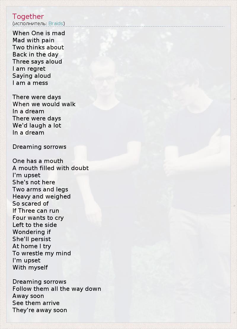 When One is mad Mad with pain Two thinks about Back in the day Three says aloud I am regret Saying aloud I am a mess There were days When we would walk In a dream There were days We'd laugh a lot In a dream Dreaming sorrows One has a mouth A mouth filled with doubt I'm upset She's not here Two arms and legs Heavy and weighed So scared of If Three can run Four wants to cry Left to the side Wondering if She'll persist At home I try To wrestle my mind I'm upset With myself Dreaming sorrows Follow them all the way down Away soon See them arrive They're away soon