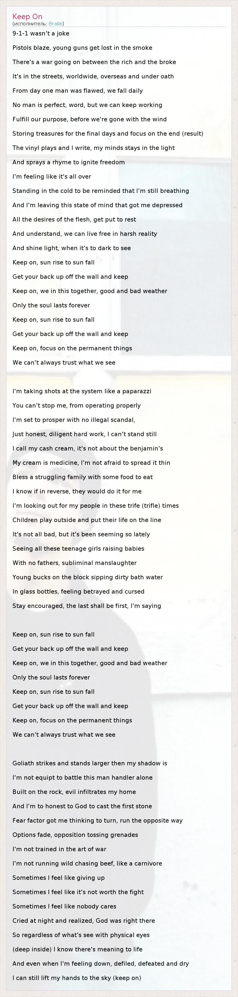 Это интересно:Существует несколько исполнителей по имени "Braille":1. Praveen Sharma - учасник электронных дуэтов Sepalcure, а также Praveen & Benoît. Кроме этого имеет пару EP в своём активе. 2. Малоизвестная хардкор группа 90-ых. 3, Bryan Winchester - MC из Портленда, штат Орегон.Брайль был близок к хип-хопу ещё с детства. Слыша разнообразие различных стилей и исполнителей,... продолжение