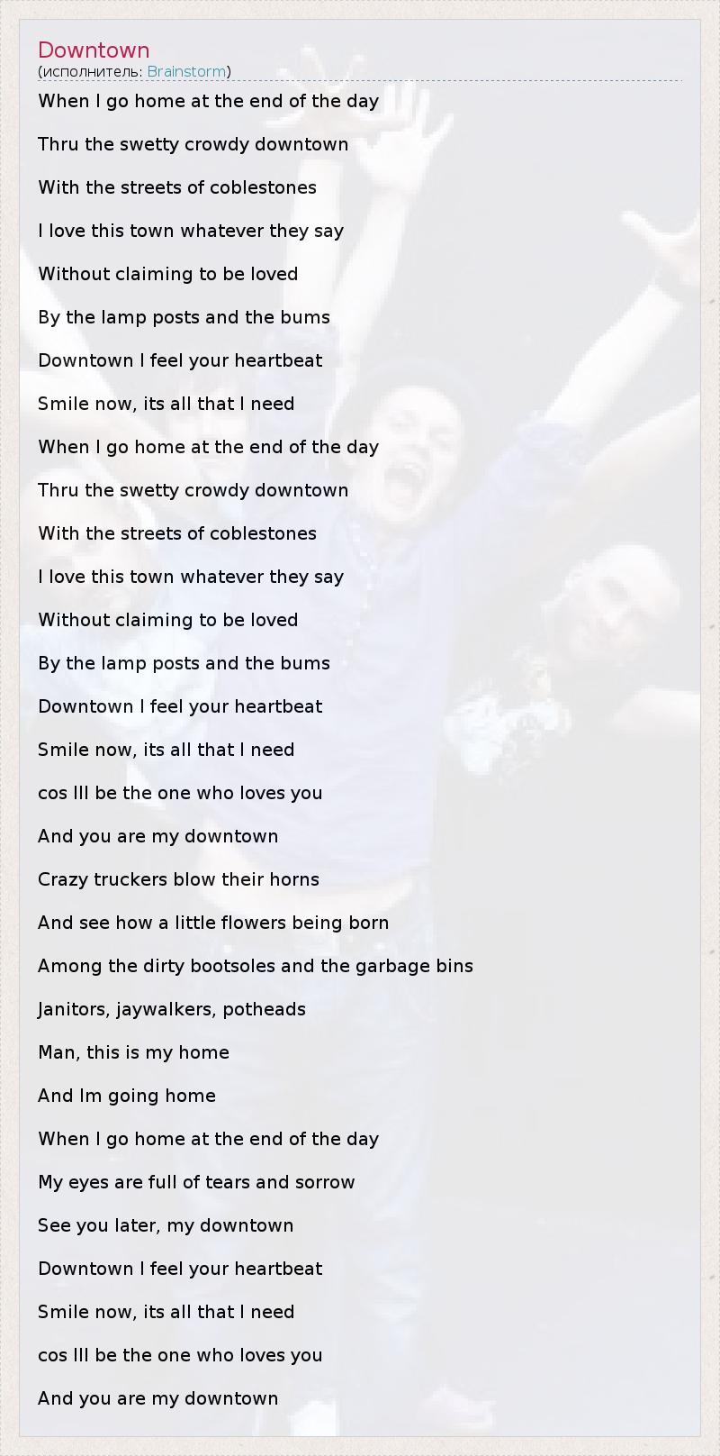 When I go home at the end of the day Thru the swetty crowdy downtown With the streets of coblestones I love this town whatever they say Without claiming to be loved By the lamp posts and the bums Downtown I feel your heartbeat Smile now, its all that I need When I go home at the end of the day Thru the swetty crowdy downtown With the streets of coblestones I love this town whatever they say Without claiming to be loved By the lamp posts and the bums Downtown I feel your heartbeat Smile now, its all that I need cos Ill be the one who loves you And you are my downtown Crazy truckers blow their horns And see how a little flowers being born Among the dirty bootsoles and the garbage bins Janitors, jaywalkers, potheads Man, this is my home And Im going home When I go home at the end of the day My eyes are full of tears and sorrow See you later, my downtown Downtown I feel your heartbeat Smile now, its all that I need cos Ill be the one who loves you And you are my downtown