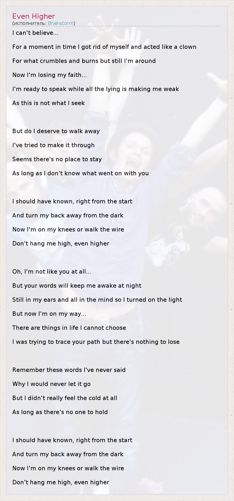 I can't believe... For a moment in time I got rid of myself and acted like a clown For what crumbles and burns but still I'm around Now I'm losing my faith... I'm ready to speak while all the lying is making me weak As this is not what I seek But do I deserve to walk away I've tried to make it through Seems there's no place to stay As long as I don't know what went on with you I should have known, right from the start And turn my back away from the dark Now I'm on my knees or walk the wire Don't hang me high, even higher Oh, I'm not like you at all... But your words will keep me awake at night Still in my ears and all in the mind so I turned on the light But now I'm on my way... There are things in life I cannot choose I was trying to trace your path but there's nothing to lose Remember these words I've never said Why I would never let it go But I didn't really feel the cold at all As long as there's no one to hold I should have known, right from the start And turn my back away from the dark Now I'm on my knees or walk the wire Don't hang me high, even higher
