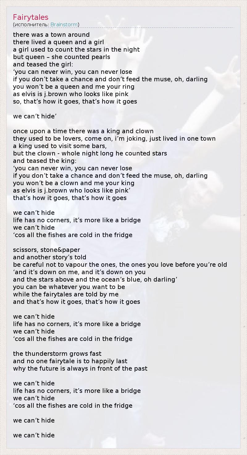 there was a town around there lived a queen and a girl a girl used to count the stars in the night but queen – she counted pearls and teased the girl: ‘you can never win, you can never lose if you don’t take a chance and don’t feed the muse, oh, darling you won’t be a queen and me your ring as elvis is j.brown who looks like pink so, that’s how it goes, that’s how it goes we can’t hide’ once upon a time there was a king and clown they used to be lovers, come on, i’m joking, just lived in one town a king used to visit some bars, but the clown - whole night long he counted stars and teased the king: ‘you can never win, you can never lose if you don’t take a chance and don’t feed the muse, oh, darling you won’t be a clown and me your king as elvis is j.brown who looks like pink’ that’s how it goes, that’s how it goes we can’t hide life has no corners, it’s more like a bridge we can’t hide ‘cos all the fishes are cold in the fridge scissors, stone&paper and another story’s told be careful not to vapour the ones, the ones you love before you’re old ‘and it’s down on me, and it’s down on you and the stars above and the ocean’s blue, oh darling’ you can be whatever you want to be while the fairytales are told by me and that’s how it goes, that’s how it goes we can’t hide life has no corners, it’s more like a bridge we can’t hide ‘cos all the fishes are cold in the fridge the thunderstorm grows fast and no one fairytale is to happily last why the future is always in front of the past we can’t hide life has no corners, it’s more like a bridge we can’t hide ‘cos all the fishes are cold in the fridge we can’t hide we can’t hide