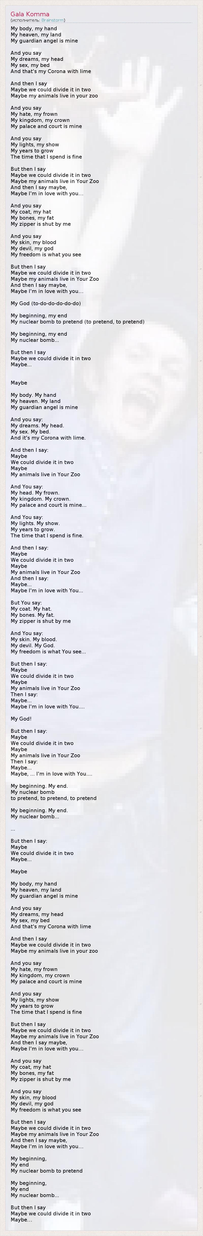 My body, my hand My heaven, my land My guardian angel is mine And you say My dreams, my head My sex, my bed And that's my Corona with lime And then I say Maybe we could divide it in two Maybe my animals live in your zoo And you say My hate, my frown My kingdom, my crown My palace and court is mine And you say My lights, my show My years to grow The time that I spend is fine But then I say Maybe we could divide it in two Maybe my animals live in Your Zoo And then I say maybe, Maybe I'm in love with you… And you say My coat, my hat My bones, my fat My zipper is shut by me And you say My skin, my blood My devil, my god My freedom is what you see But then I say Maybe we could divide it in two Maybe my animals live in Your Zoo And then I say maybe, Maybe I'm in love with you… My God (to-do-do-do-do-do) My beginning, my end My nuclear bomb to pretend (to pretend, to pretend) My beginning, my end My nuclear bomb... But then I say Maybe we could divide it in two Maybe... Maybe My body. My hand My heaven. My land My guardian angel is mine And you say: My dreams. My head. My sex. My bed. And it's my Corona with lime. And then I say: Maybe We could divide it in two Maybe My animals live in Your Zoo And You say: My head. My frown. My kingdom. My crown. My palace and court is mine... And You say: My lights. My show. My years to grow. The time that I spend is fine. And then I say: Maybe We could divide it in two Maybe My animals live in Your Zoo And then I say: Maybe... Maybe I'm in love with You... But You say: My coat. My hat. My bones. My fat. My zipper is shut by me And You say: My skin. My blood. My devil. My God. My freedom is what You see... But then I say: Maybe We could divide it in two Maybe My animals live in Your Zoo Then I say: Maybe... Maybe I'm in love with You.... My God! But then I say: Maybe We could divide it in two Maybe My animals live in Your Zoo Then I say: Maybe... Maybe, ... I'm in love with You.... My beginning. My end. My nuclear bomb to pretend, to pretend, to pretend My beginning. My end. My nuclear bomb... ... But then I say: Maybe We could divide it in two Maybe... Maybe My body, my hand My heaven, my land My guardian angel is mine And you say My dreams, my head My sex, my bed And that's my Corona with lime And then I say Maybe we could divide it in two Maybe my animals live in your zoo And you say My hate, my frown My kingdom, my crown My palace and court is mine And you say My lights, my show My years to grow The time that I spend is fine But then I say Maybe we could divide it in two Maybe my animals live in Your Zoo And then I say maybe, Maybe I'm in love with you… And you say My coat, my hat My bones, my fat My zipper is shut by me And you say My skin, my blood My devil, my god My freedom is what you see But then I say Maybe we could divide it in two Maybe my animals live in Your Zoo And then I say maybe, Maybe I'm in love with you… My beginning, My end My nuclear bomb to pretend My beginning, My end My nuclear bomb... But then I say Maybe we could divide it in two Maybe…