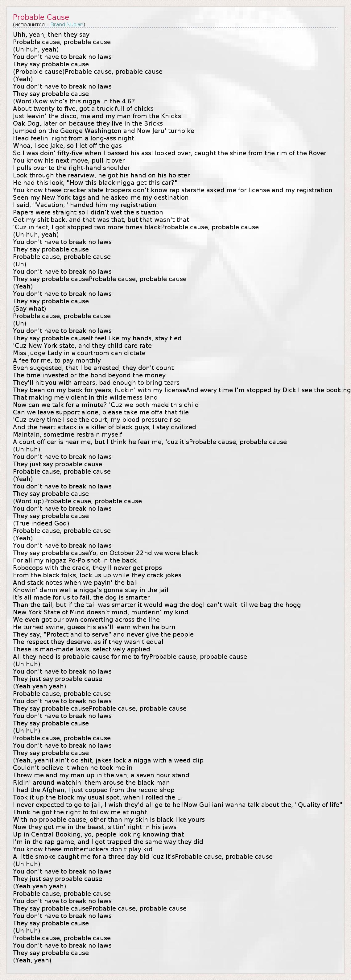 Uhh, yeah, then they say Probable cause, probable cause (Uh huh, yeah) You don't have to break no laws They say probable cause (Probable cause)Probable cause, probable cause (Yeah) You don't have to break no laws They say probable cause (Word)Now who's this nigga in the 4.6? About twenty to five, got a truck full of chicks Just leavin' the disco, me and my man from the Knicks Oak Dog, later on because they live in the Bricks Jumped on the George Washington and Now Jeru' turnpike Head feelin' right from a long-ass night Whoa, I see Jake, so I let off the gas So I was doin' fifty-five when I passed his assI looked over, caught the shine from the rim of the Rover You know his next move, pull it over I pulls over to the right-hand shoulder Look through the rearview, he got his hand on his holster He had this look, "How this black nigga get this car?" You know these cracker state troopers don't know rap starsHe asked me for license and my registration Seen my New York tags and he asked me my destination I said, "Vacation," handed him my registration Papers were straight so I didn't wet the situation Got my shit back, and that was that, but that wasn't that 'Cuz in fact, I got stopped two more times blackProbable cause, probable cause (Uh huh, yeah) You don't have to break no laws They say probable cause Probable cause, probable cause (Uh) You don't have to break no laws They say probable causeProbable cause, probable cause (Yeah) You don't have to break no laws They say probable cause (Say what) Probable cause, probable cause (Uh) You don't have to break no laws They say probable causeIt feel like my hands, stay tied 'Cuz New York state, and they child care rate Miss Judge Lady in a courtroom can dictate A fee for me, to pay monthly Even suggested, that I be arrested, they don't count The time invested or the bond beyond the money They'll hit you with arrears, bad enough to bring tears They been on my back for years, fuckin' with my licenseAnd every time I'm stopped by Dick I see the booking That making me violent in this wilderness land Now can we talk for a minute? 'Cuz we both made this child Can we leave support alone, please take me offa that file 'Cuz every time I see the court, my blood pressure rise And the heart attack is a killer of black guys, I stay civilized Maintain, sometime restrain myself A court officer is near me, but I think he fear me, 'cuz it'sProbable cause, probable cause (Uh huh) You don't have to break no laws They just say probable cause Probable cause, probable cause (Yeah) You don't have to break no laws They say probable cause (Word up)Probable cause, probable cause You don't have to break no laws They say probable cause (True indeed God) Probable cause, probable cause (Yeah) You don't have to break no laws They say probable causeYo, on October 22nd we wore black For all my niggaz Po-Po shot in the back Robocops with the crack, they'll never get props From the black folks, lock us up while they crack jokes And stack notes when we payin' the bail Knowin' damn well a nigga's gonna stay in the jail It's all made for us to fail, the dog is smarter Than the tail, but if the tail was smarter it would wag the dogI can't wait 'til we bag the hogg New York State of Mind doesn't mind, murderin' my kind We even got our own converting across the line He turned swine, guess his ass'll learn when he burn They say, "Protect and to serve" and never give the people The respect they deserve, as if they wasn't equal These is man-made laws, selectively applied All they need is probable cause for me to fryProbable cause, probable cause (Uh huh) You don't have to break no laws They just say probable cause (Yeah yeah yeah) Probable cause, probable cause You don't have to break no laws They say probable causeProbable cause, probable cause You don't have to break no laws They say probable cause (Uh huh) Probable cause, probable cause You don't have to break no laws They say probable cause (Yeah, yeah)I ain't do shit, jakes lock a nigga with a weed clip Couldn't believe it when he took me in Threw me and my man up in the van, a seven hour stand Ridin' around watchin' them arouse the black man I had the Afghan, I just copped from the record shop Took it up the block my usual spot, when I rolled the L I never expected to go to jail, I wish they'd all go to hellNow Guiliani wanna talk about the, "Quality of life" Think he got the right to follow me at night With no probable cause, other than my skin is black like yours Now they got me in the beast, sittin' right in his jaws Up in Central Booking, yo, people looking knowing that I'm in the rap game, and I got trapped the same way they did You know these motherfuckers don't play kid A little smoke caught me for a three day bid 'cuz it'sProbable cause, probable cause (Uh huh) You don't have to break no laws They just say probable cause (Yeah yeah yeah) Probable cause, probable cause You don't have to break no laws They say probable causeProbable cause, probable cause You don't have to break no laws They say probable cause (Uh huh) Probable cause, probable cause You don't have to break no laws They say probable cause (Yeah, yeah)