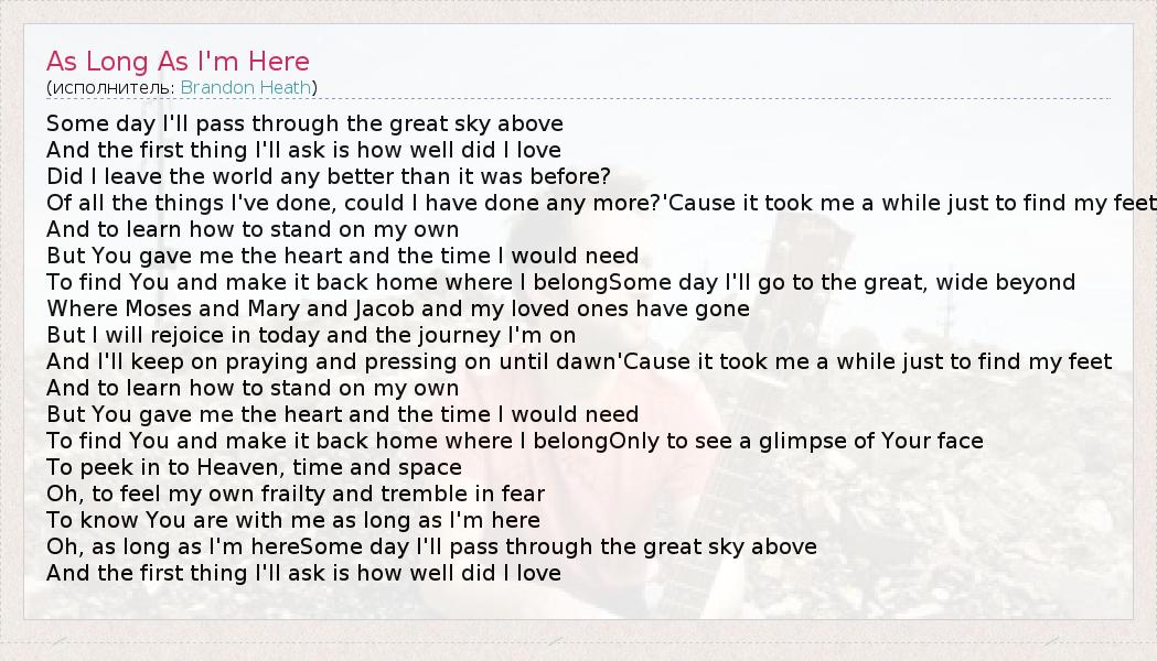 Some day I'll pass through the great sky above And the first thing I'll ask is how well did I love Did I leave the world any better than it was before? Of all the things I've done, could I have done any more?'Cause it took me a while just to find my feet And to learn how to stand on my own But You gave me the heart and the time I would need To find You and make it back home where I belongSome day I'll go to the great, wide beyond Where Moses and Mary and Jacob and my loved ones have gone But I will rejoice in today and the journey I'm on And I'll keep on praying and pressing on until dawn'Cause it took me a while just to find my feet And to learn how to stand on my own But You gave me the heart and the time I would need To find You and make it back home where I belongOnly to see a glimpse of Your face To peek in to Heaven, time and space Oh, to feel my own frailty and tremble in fear To know You are with me as long as I'm here Oh, as long as I'm hereSome day I'll pass through the great sky above And the first thing I'll ask is how well did I love
