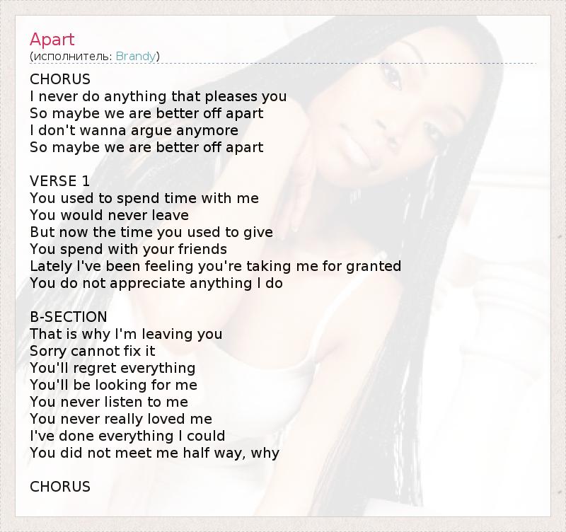 Это интересно:Брэнди - (англ. - Brandy Rayana Norwood род. 11 февраля 1979 г.) - американская певица, автор песен, продюсер и актриса. Обладательница премии "Грэмми". Согласно данным американской ассоциации звукозаписывающих компаний (RIAA) Брэнди является одной из самых успешных певиц Америки, продавшей около 9 миллионов копий альбомов на территории США и 25 миллионов по всему миру. Brandy начала петь, раньше,... продолжение