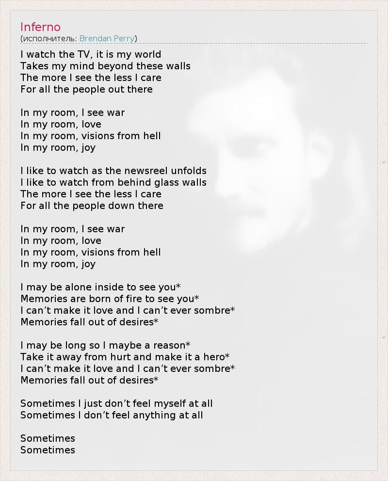 I watch the TV, it is my world Takes my mind beyond these walls The more I see the less I care For all the people out there In my room, I see war In my room, love In my room, visions from hell In my room, joy I like to watch as the newsreel unfolds I like to watch from behind glass walls The more I see the less I care For all the people down there In my room, I see war In my room, love In my room, visions from hell In my room, joy I may be alone inside to see you* Memories are born of fire to see you* I can’t make it love and I can’t ever sombre* Memories fall out of desires* I may be long so I maybe a reason* Take it away from hurt and make it a hero* I can’t make it love and I can’t ever sombre* Memories fall out of desires* Sometimes I just don’t feel myself at all Sometimes I don’t feel anything at all Sometimes Sometimes