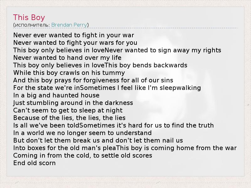 Never ever wanted to fight in your war Never wanted to fight your wars for you This boy only believes in loveNever wanted to sign away my rights Never wanted to hand over my life This boy only believes in loveThis boy bends backwards While this boy crawls on his tummy And this boy prays for forgiveness for all of our sins For the state we're inSometimes I feel like I'm sleepwalking In a big and haunted house Just stumbling around in the darkness Can't seem to get to sleep at night Because of the lies, the lies, the lies Is all we've been toldSometimes it's hard for us to find the truth In a world we no longer seem to understand But don't let them break us and don't let them nail us Into boxes for the old man's pleaThis boy is coming home from the war Coming in from the cold, to settle old scores End old scorn