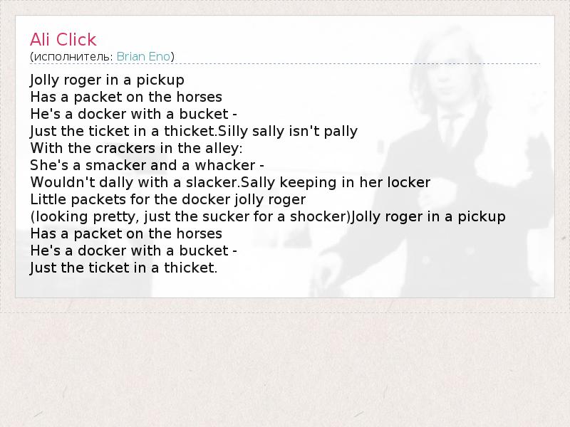 Jolly roger in a pickup Has a packet on the horses He's a docker with a bucket - Just the ticket in a thicket.Silly sally isn't pally With the crackers in the alley: She's a smacker and a whacker - Wouldn't dally with a slacker.Sally keeping in her locker Little packets for the docker jolly roger (looking pretty, just the sucker for a shocker)Jolly roger in a pickup Has a packet on the horses He's a docker with a bucket - Just the ticket in a thicket.