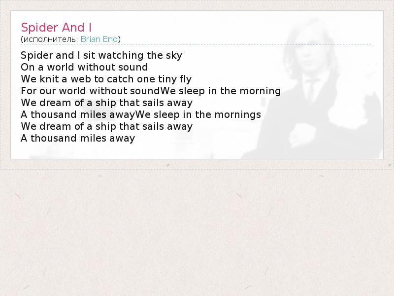 Spider and I sit watching the sky On a world without sound We knit a web to catch one tiny fly For our world without soundWe sleep in the morning We dream of a ship that sails away A thousand miles awayWe sleep in the mornings We dream of a ship that sails away A thousand miles away