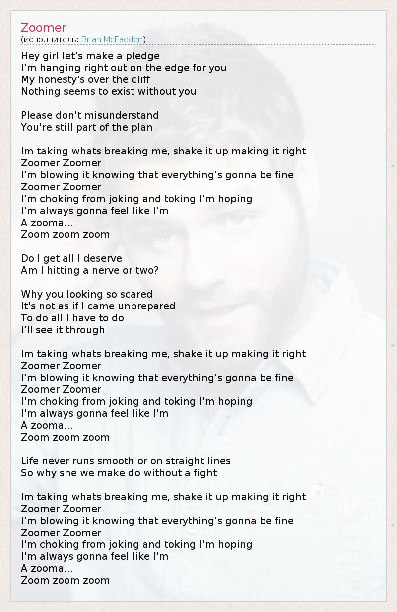 Hey girl let's make a pledge I'm hanging right out on the edge for you My honesty's over the cliff Nothing seems to exist without you Please don't misunderstand You're still part of the plan Im taking whats breaking me, shake it up making it right Zoomer Zoomer I'm blowing it knowing that everything's gonna be fine Zoomer Zoomer I'm choking from joking and toking I'm hoping I'm always gonna feel like I'm A zooma... Zoom zoom zoom Do I get all I deserve Am I hitting a nerve or two? Why you looking so scared It's not as if I came unprepared To do all I have to do I'll see it through Im taking whats breaking me, shake it up making it right Zoomer Zoomer I'm blowing it knowing that everything's gonna be fine Zoomer Zoomer I'm choking from joking and toking I'm hoping I'm always gonna feel like I'm A zooma... Zoom zoom zoom Life never runs smooth or on straight lines So why she we make do without a fight Im taking whats breaking me, shake it up making it right Zoomer Zoomer I'm blowing it knowing that everything's gonna be fine Zoomer Zoomer I'm choking from joking and toking I'm hoping I'm always gonna feel like I'm A zooma... Zoom zoom zoom