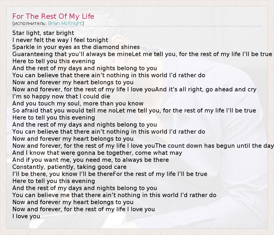 Star light, star bright I never felt the way I feel tonight Sparkle in your eyes as the diamond shines Guaranteeing that you'll always be mineLet me tell you, for the rest of my life I'll be true Here to tell you this evening And the rest of my days and nights belong to you You can believe that there ain't nothing in this world I'd rather do Now and forever my heart belongs to you Now and forever, for the rest of my life I love youAnd it's all right, go ahead and cry I'm so happy now that I could die And you touch my soul, more than you know So afraid that you would tell me noLet me tell you, for the rest of my life I'll be true Here to tell you this evening And the rest of my days and nights belong to you You can believe that there ain't nothing in this world I'd rather do Now and forever my heart belongs to you Now and forever, for the rest of my life I love youThe count down has begun until the day And I know that were gonna be together, come what may And if you want me, you need me, to always be there Constantly, patiently, taking good care I'll be there, you know I'll be thereFor the rest of my life I'll be true Here to tell you this evening And the rest of my days and nights belong to you You can believe me that there ain't nothing in this world I'd rather do Now and forever my heart belongs to you Now and forever, for the rest of my life I love you I love you