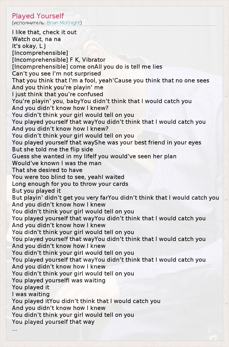 I like that, check it out Watch out, na na It's okay, L J [Incomprehensible] [Incomprehensible] F K, Vibrator [Incomprehensible] come onAll you do is tell me lies Can't you see I'm not surprised That you think that I'm a fool, yeah'Cause you think that no one sees And you think you're playin' me I just think that you're confused You're playin' you, babyYou didn't think that I would catch you And you didn't know how I knew? You didn't think your girl would tell on you You played yourself that wayYou didn't think that I would catch you And you didn't know how I knew? You didn't think your girl would tell on you You played yourself that wayShe was your best friend in your eyes But she told me the flip side Guess she wanted in my lifeIf you would've seen her plan Would've known I was the man That she desired to have You were too blind to see, yeahI waited Long enough for you to throw your cards But you played it But playin' didn't get you very farYou didn't think that I would catch you And you didn't know how I knew You didn't think your girl would tell on you You played yourself that wayYou didn't think that I would catch you And you didn't know how I knew You didn't think your girl would tell on you You played yourself that wayYou didn't think that I would catch you And you didn't know how I knew You didn't think your girl would tell on you You played yourself that wayYou didn't think that I would catch you And you didn't know how I knew You didn't think your girl would tell on you You played yourselfI was waiting You played it I was waiting You played itYou didn't think that I would catch you And you didn't know how I knew You didn't think your girl would tell on you You played yourself that way ...