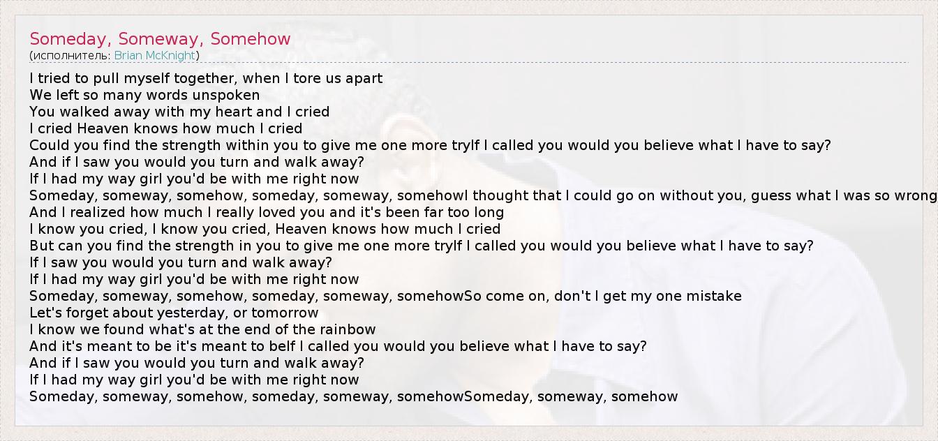 Someday, someway, somehow, someday, someway, somehowI thought that I could go on without you, guess what I was so wrong