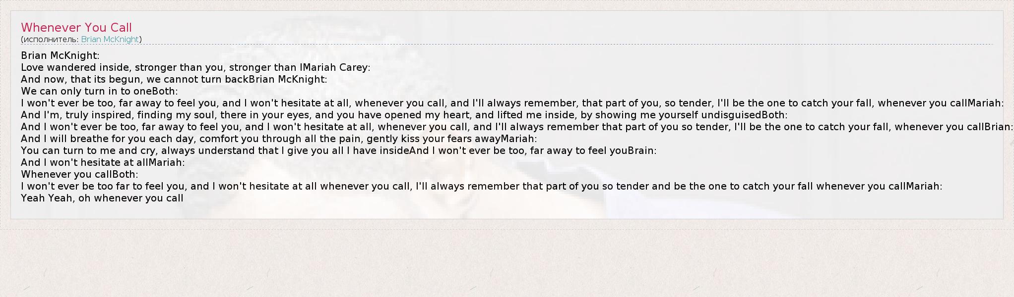 Brian McKnight: Love wandered inside, stronger than you, stronger than IMariah Carey: And now, that its begun, we cannot turn backBrian McKnight: We can only turn in to oneBoth: I won't ever be too, far away to feel you, and I won't hesitate at all, whenever you call, and I'll always remember, that part of you, so tender, I'll be the one to catch your fall, whenever you callMariah: And I'm, truly inspired, finding my soul, there in your eyes, and you have opened my heart, and lifted me inside, by showing me yourself undisguisedBoth: And I won't ever be too, far away to feel you, and I won't hesitate at all, whenever you call, and I'll always remember that part of you so tender, I'll be the one to catch your fall, whenever you callBrian: And I will breathe for you each day, comfort you through all the pain, gently kiss your fears awayMariah: You can turn to me and cry, always understand that I give you all I have insideAnd I won't ever be too, far away to feel youBrain: And I won't hesitate at allMariah: Whenever you callBoth: I won't ever be too far to feel you, and I won't hesitate at all whenever you call, I'll always remember that part of you so tender and be the one to catch your fall whenever you callMariah: Yeah Yeah, oh whenever you call