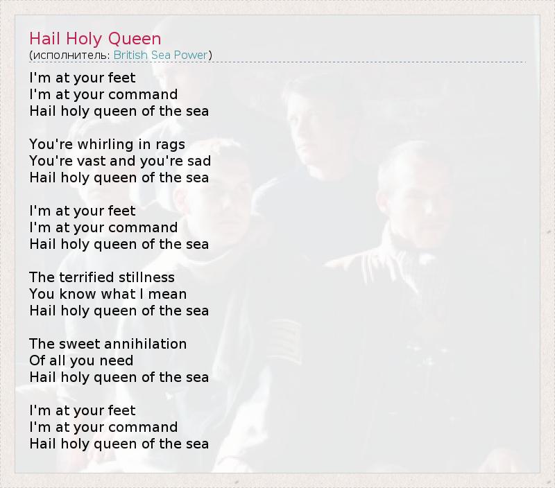 I'm at your feet I'm at your command Hail holy queen of the sea You're whirling in rags You're vast and you're sad Hail holy queen of the sea I'm at your feet I'm at your command Hail holy queen of the sea The terrified stillness You know what I mean Hail holy queen of the sea The sweet annihilation Of all you need Hail holy queen of the sea I'm at your feet I'm at your command Hail holy queen of the sea