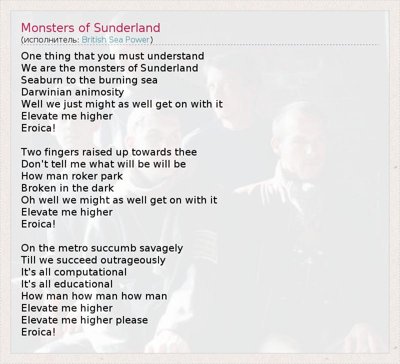 One thing that you must understand We are the monsters of Sunderland Seaburn to the burning sea Darwinian animosity Well we just might as well get on with it Elevate me higher Eroica! Two fingers raised up towards thee Don't tell me what will be will be How man roker park Broken in the dark Oh well we might as well get on with it Elevate me higher Eroica! On the metro succumb savagely Till we succeed outrageously It's all computational It's all educational How man how man how man Elevate me higher Elevate me higher please Eroica!