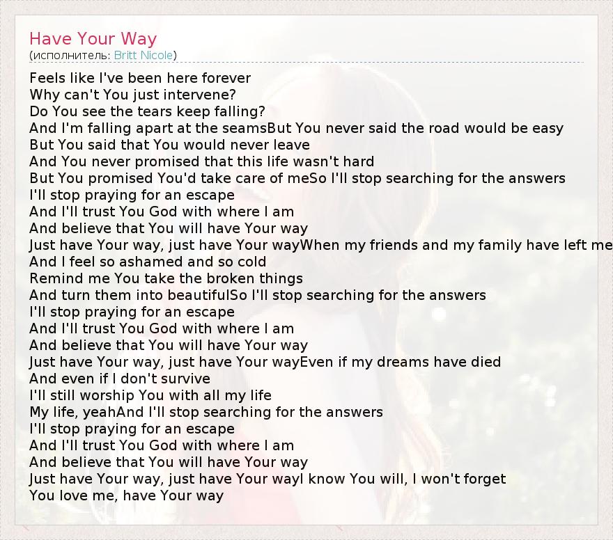 А как ты думаешь, о чем песня "Have Your Way" ?