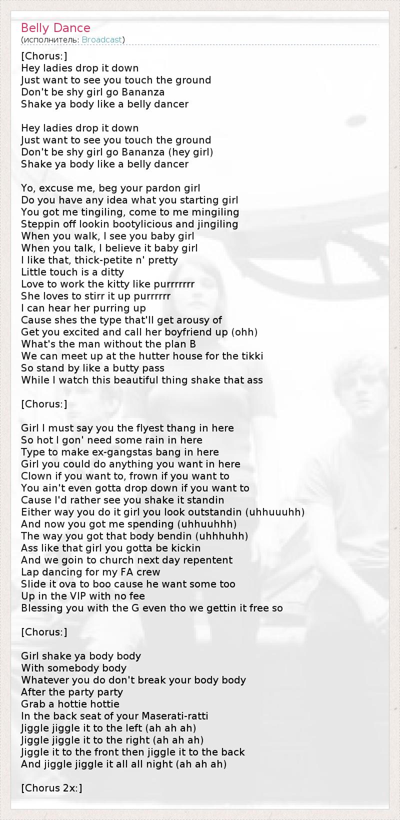 [Chorus:] Hey ladies drop it down Just want to see you touch the ground Don't be shy girl go Bananza Shake ya body like a belly dancer Hey ladies drop it down Just want to see you touch the ground Don't be shy girl go Bananza (hey girl) Shake ya body like a belly dancer Yo, excuse me, beg your pardon girl Do you have any idea what you starting girl You got me tingiling, come to me mingiling Steppin off lookin bootylicious and jingiling When you walk, I see you baby girl When you talk, I believe it baby girl I like that, thick-petite n' pretty Little touch is a ditty Love to work the kitty like purrrrrrr She loves to stirr it up purrrrrr I can hear her purring up Cause shes the type that'll get arousy of Get you excited and call her boyfriend up (ohh) What's the man without the plan B We can meet up at the hutter house for the tikki So stand by like a butty pass While I watch this beautiful thing shake that ass [Chorus:] Girl I must say you the flyest thang in here So hot I gon' need some rain in here Type to make ex-gangstas bang in here Girl you could do anything you want in here Clown if you want to, frown if you want to You ain't even gotta drop down if you want to Cause I'd rather see you shake it standin Either way you do it girl you look outstandin (uhhuuuhh) And now you got me spending (uhhuuhhh) The way you got that body bendin (uhhhuhh) Ass like that girl you gotta be kickin And we goin to church next day repentent Lap dancing for my FA crew Slide it ova to boo cause he want some too Up in the VIP with no fee Blessing you with the G even tho we gettin it free so [Chorus:] Girl shake ya body body With somebody body Whatever you do don't break your body body After the party party Grab a hottie hottie In the back seat of your Maserati-ratti Jiggle jiggle it to the left (ah ah ah) Jiggle jiggle it to the right (ah ah ah) Jiggle it to the front then jiggle it to the back And jiggle jiggle it all all night (ah ah ah) [Chorus 2x:]