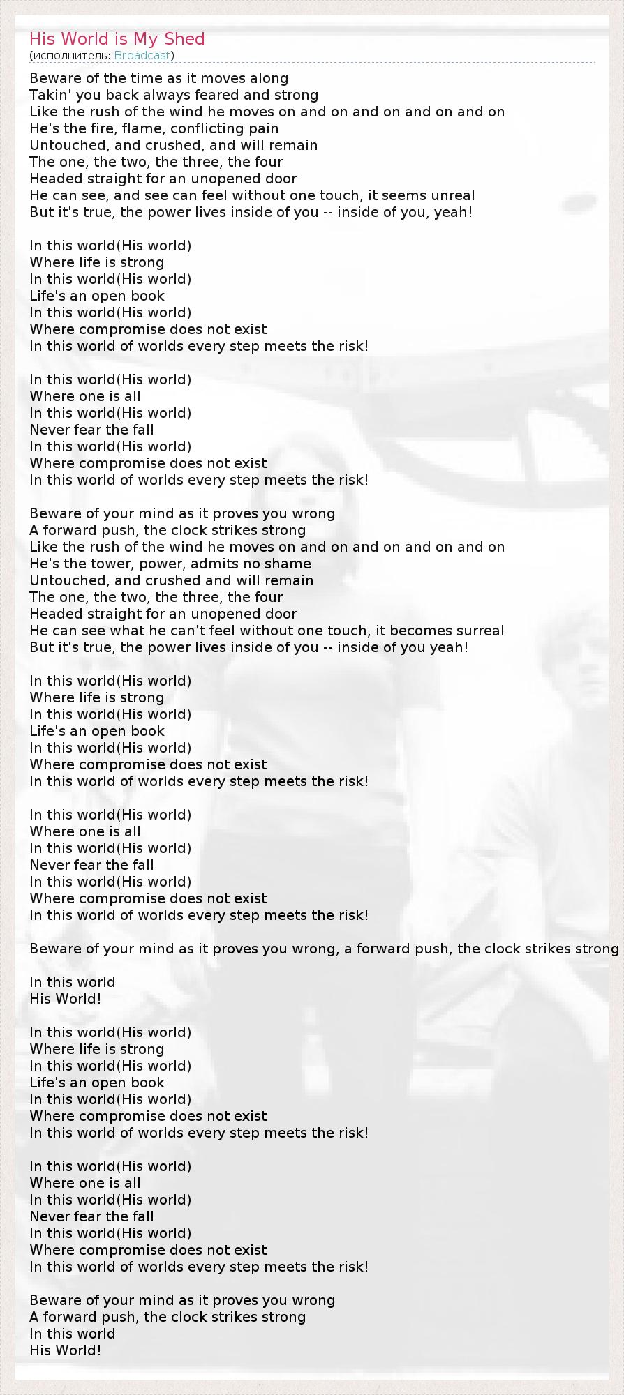 А как ты думаешь, о чем песня "His World is My Shed" ?