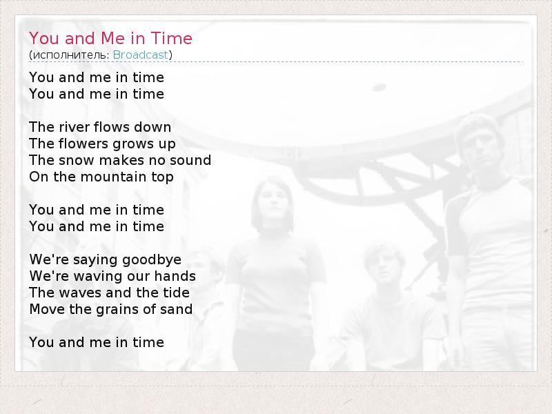 You and me in time You and me in time The river flows down The flowers grows up The snow makes no sound On the mountain top You and me in time You and me in time We're saying goodbye We're waving our hands The waves and the tide Move the grains of sand You and me in time