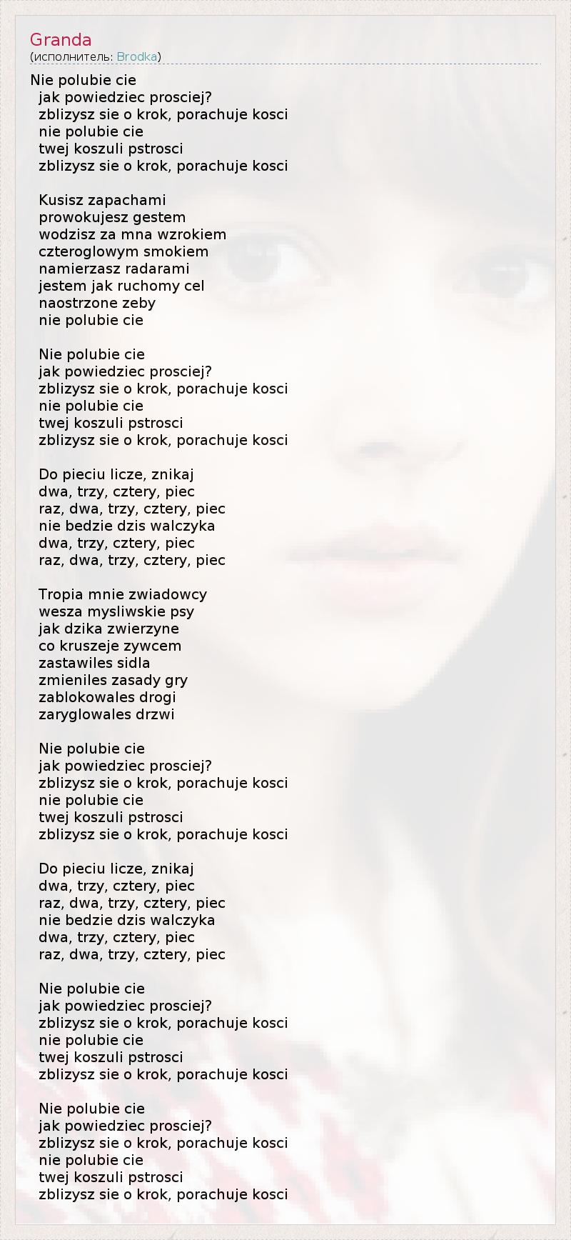 Nie polubie cie jak powiedziec prosciej? zblizysz sie o krok, porachuje kosci nie polubie cie twej koszuli pstrosci zblizysz sie o krok, porachuje kosci Kusisz zapachami prowokujesz gestem wodzisz za mna wzrokiem czteroglowym smokiem namierzasz radarami jestem jak ruchomy cel naostrzone zeby nie polubie cie Nie polubie cie jak powiedziec prosciej? zblizysz sie o krok, porachuje kosci nie polubie cie twej koszuli pstrosci zblizysz sie o krok, porachuje kosci Do pieciu licze, znikaj dwa, trzy, cztery, piec raz, dwa, trzy, cztery, piec nie bedzie dzis walczyka dwa, trzy, cztery, piec raz, dwa, trzy, cztery, piec Tropia mnie zwiadowcy wesza mysliwskie psy jak dzika zwierzyne co kruszeje zywcem zastawiles sidla zmieniles zasady gry zablokowales drogi zaryglowales drzwi Nie polubie cie jak powiedziec prosciej? zblizysz sie o krok, porachuje kosci nie polubie cie twej koszuli pstrosci zblizysz sie o krok, porachuje kosci Do pieciu licze, znikaj dwa, trzy, cztery, piec raz, dwa, trzy, cztery, piec nie bedzie dzis walczyka dwa, trzy, cztery, piec raz, dwa, trzy, cztery, piec Nie polubie cie jak powiedziec prosciej? zblizysz sie o krok, porachuje kosci nie polubie cie twej koszuli pstrosci zblizysz sie o krok, porachuje kosci Nie polubie cie jak powiedziec prosciej? zblizysz sie o krok, porachuje kosci nie polubie cie twej koszuli pstrosci zblizysz sie o krok, porachuje kosci