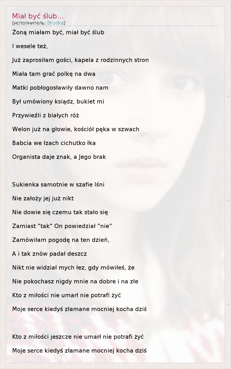 Żoną miałam być, miał być ślub I wesele też, Już zaprosiłam gości, kapela z rodzinnych stron Miała tam grać polkę na dwa Matki pobłogosławiły dawno nam Był umówiony ksiądz, bukiet mi Przywieźli z białych róż Welon już na głowie, kościół pęka w szwach Babcia we łzach cichutko łka Organista daje znak, a Jego brak Sukienka samotnie w szafie lśni Nie założy jej już nikt Nie dowie się czemu tak stało się Zamiast "tak" On powiedział "nie" Zamówiłam pogodę na ten dzień, A i tak znów padał deszcz Nikt nie widział mych łez, gdy mówiłeś, że Nie pokochasz nigdy mnie na dobre i na złe Kto z miłości nie umarł nie potrafi żyć Moje serce kiedyś złamane mocniej kocha dziś Kto z miłości jeszcze nie umarł nie potrafi żyć Moje serce kiedyś złamane mocniej kocha dziś
