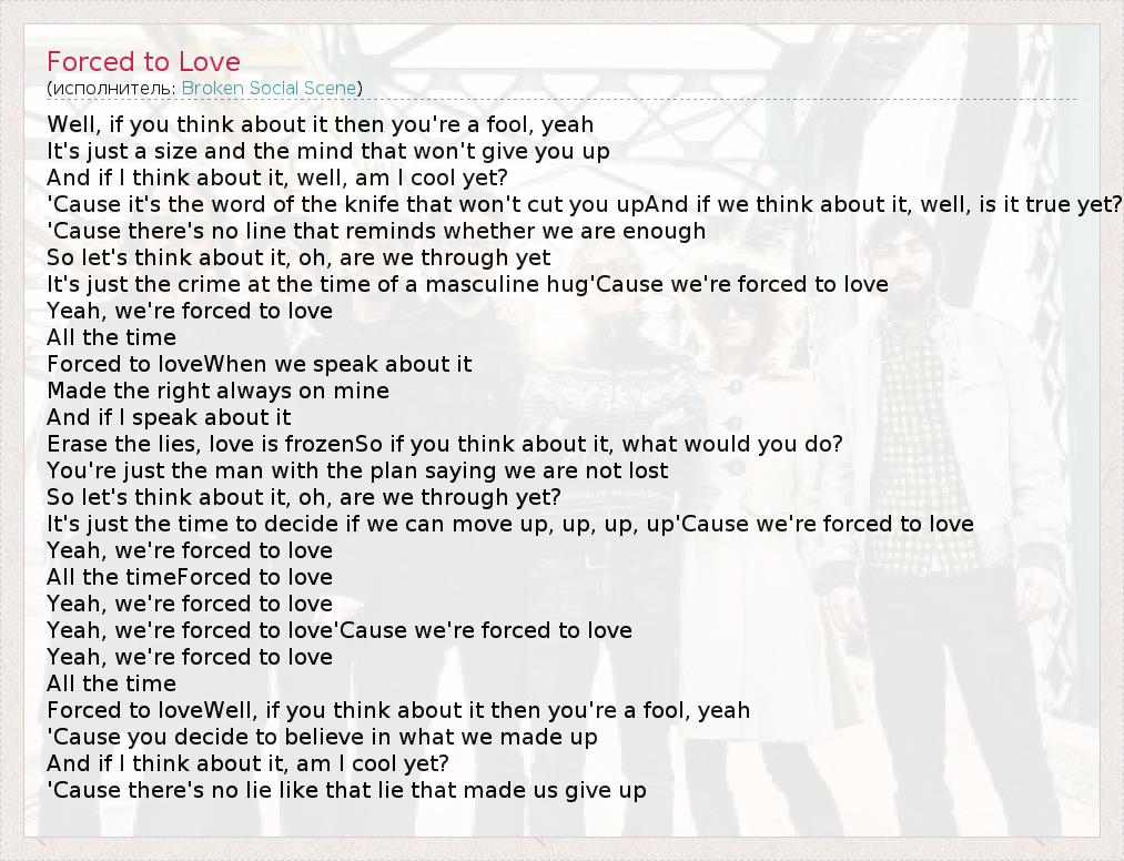 Well, if you think about it then you're a fool, yeah It's just a size and the mind that won't give you up And if I think about it, well, am I cool yet? 'Cause it's the word of the knife that won't cut you upAnd if we think about it, well, is it true yet? 'Cause there's no line that reminds whether we are enough So let's think about it, oh, are we through yet It's just the crime at the time of a masculine hug'Cause we're forced to love Yeah, we're forced to love All the time Forced to loveWhen we speak about it Made the right always on mine And if I speak about it Erase the lies, love is frozenSo if you think about it, what would you do? You're just the man with the plan saying we are not lost So let's think about it, oh, are we through yet? It's just the time to decide if we can move up, up, up, up'Cause we're forced to love Yeah, we're forced to love All the timeForced to love Yeah, we're forced to love Yeah, we're forced to love'Cause we're forced to love Yeah, we're forced to love All the time Forced to loveWell, if you think about it then you're a fool, yeah 'Cause you decide to believe in what we made up And if I think about it, am I cool yet? 'Cause there's no lie like that lie that made us give up