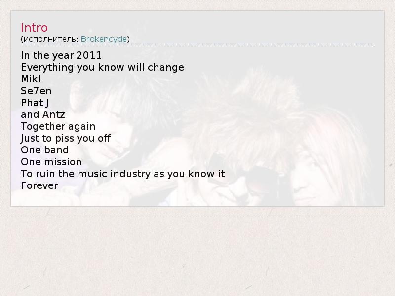 Это интересно:BrokeNCYDE на MySpaceBrokencyde американская музыкальная группа, основанная в Альбукерке, Нью-Мексико, США, в 2006 году и играющая в стиле Crunkcore.Коллектив был основан вокалистами Se7en'ом и Mikl'ом. Согласно данному группой интервью, название группы происходит из смысловой составляющей материала... продолжение