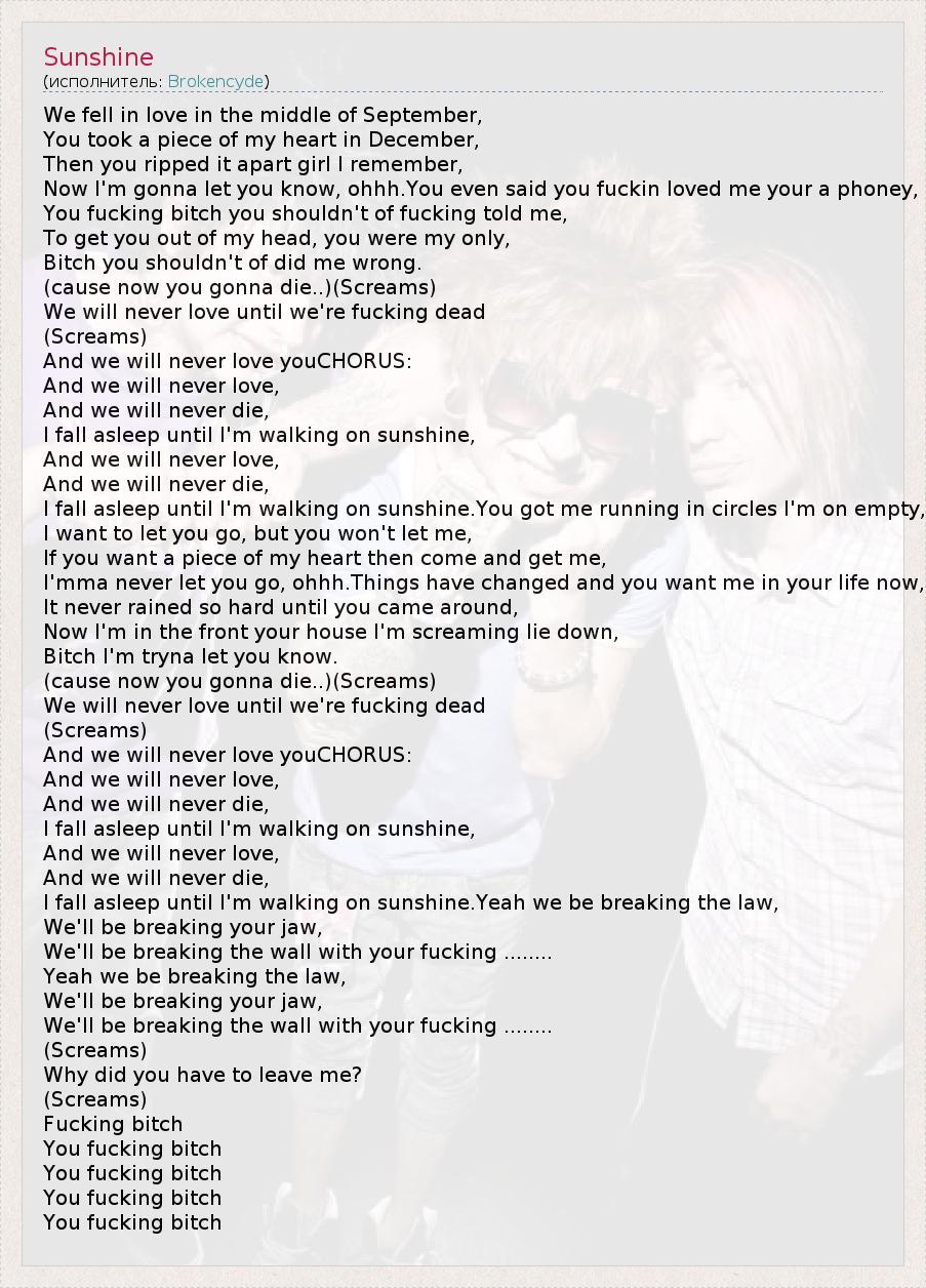 We fell in love in the middle of September, You took a piece of my heart in December, Then you ripped it apart girl I remember, Now I'm gonna let you know, ohhh.You even said you fuckin loved me your a phoney, You fucking bitch you shouldn't of fucking told me, To get you out of my head, you were my only, Bitch you shouldn't of did me wrong. (cause now you gonna die..)(Screams) We will never love until we're fucking dead (Screams) And we will never love youCHORUS: And we will never love, And we will never die, I fall asleep until I'm walking on sunshine, And we will never love, And we will never die, I fall asleep until I'm walking on sunshine.You got me running in circles I'm on empty, I want to let you go, but you won't let me, If you want a piece of my heart then come and get me, I'mma never let you go, ohhh.Things have changed and you want me in your life now, It never rained so hard until you came around, Now I'm in the front your house I'm screaming lie down, Bitch I'm tryna let you know. (cause now you gonna die..)(Screams) We will never love until we're fucking dead (Screams) And we will never love youCHORUS: And we will never love, And we will never die, I fall asleep until I'm walking on sunshine, And we will never love, And we will never die, I fall asleep until I'm walking on sunshine.Yeah we be breaking the law, We'll be breaking your jaw, We'll be breaking the wall with your fucking ........ Yeah we be breaking the law, We'll be breaking your jaw, We'll be breaking the wall with your fucking ........ (Screams) Why did you have to leave me? (Screams) Fucking bitch You fucking bitch You fucking bitch You fucking bitch You fucking bitch