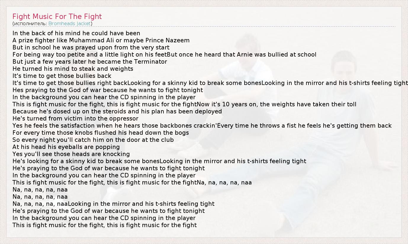 In the back of his mind he could have been A prize fighter like Muhammad Ali or maybe Prince Nazeem But in school he was prayed upon from the very start For being way too petite and a little light on his feetBut once he heard that Arnie was bullied at school But just a few years later he became the Terminator He turned his mind to steak and weights It's time to get those bullies back It's time to get those bullies right backLooking for a skinny kid to break some bonesLooking in the mirror and his t-shirts feeling tight Hes praying to the God of war because he wants to fight tonight In the background you can hear the CD spinning in the player This is fight music for the fight, this is fight music for the fightNow it's 10 years on, the weights have taken their toll Because he's dosed up on the steroids and his plan has been deployed He's turned from victim into the oppressor Yes he feels the satisfaction when he hears those backbones crackin'Every time he throws a fist he feels he's getting them back For every time those knobs flushed his head down the bogs So every night you'll catch him on the door at the club At his head his eyeballs are popping Yes you'll see those heads are knocking He's looking for a skinny kid to break some bonesLooking in the mirror and his t-shirts feeling tight He's praying to the God of war because he wants to fight tonight In the background you can hear the CD spinning in the player This is fight music for the fight, this is fight music for the fightNa, na, na, na, naa Na, na, na, na, naa Na, na, na, na, naa Na, na, na, na, naaLooking in the mirror and his t-shirts feeling tight He's praying to the God of war because he wants to fight tonight In the background you can hear the CD spinning in the player This is fight music for the fight, this is fight music for the fight