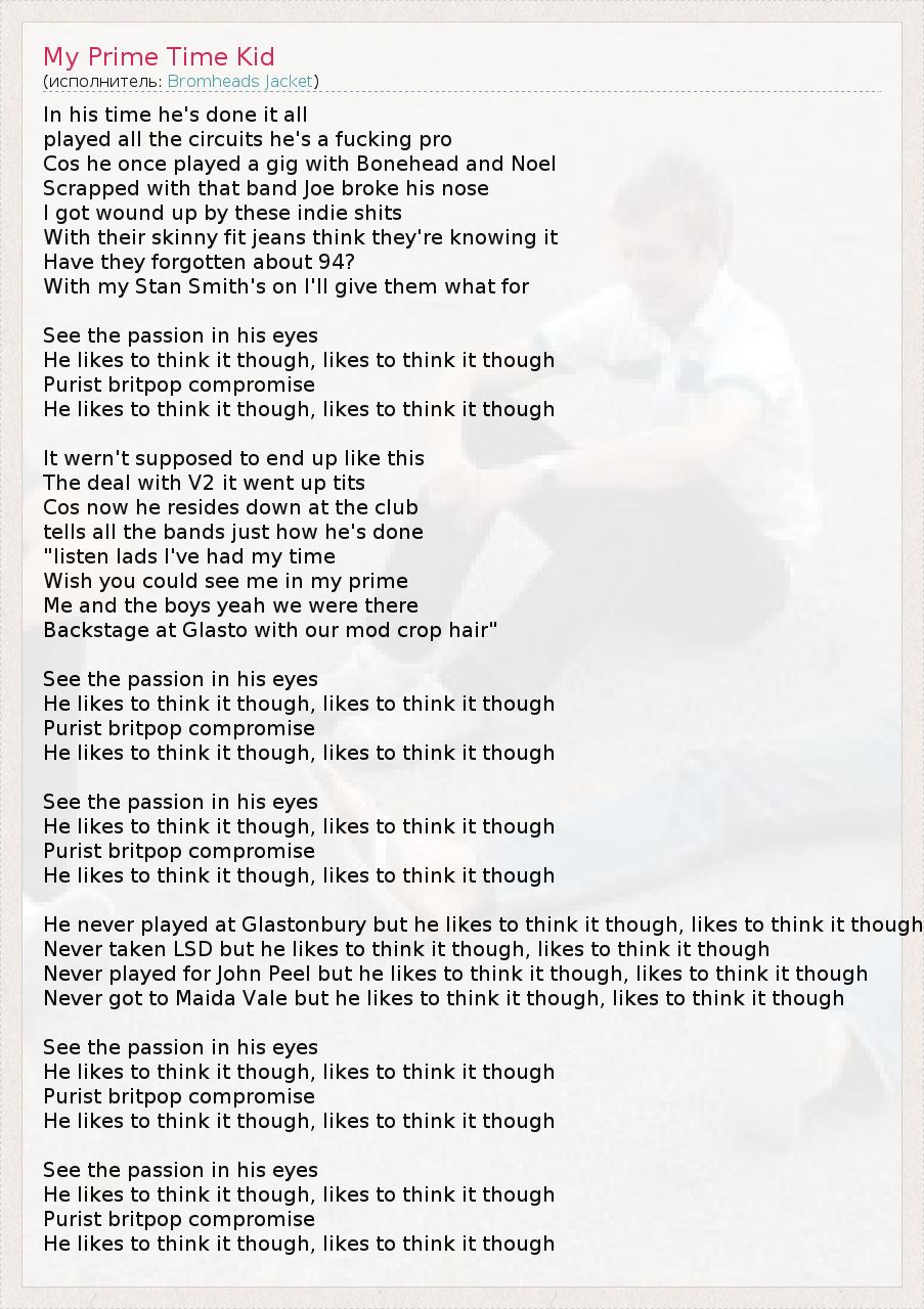 В свое время он сделал все это играл все цепи он чертовски про Потому что он когда-то играл концерт с балбес и Ноэль Уничтоженный с этой группой Джо сломал нос Меня завели этими инди гадит С их тощие подходят джинсы думаю, что они , зная его Есть ли у них забыли о 94 ? С на моем Стэна Смита я дам им, что для Смотреть страсть в его глазах Он любит думать его, хотя, любит думать , хотя он Purist BritPop компромисс Он любит думать его, хотя, любит думать , хотя он Предполагалось wern't в конечном итоге, как это Сделка с V2 она увеличилась грудь Потому сейчас он проживает вниз в клубе говорит все группы , насколько он сделал " слушать парней у меня было свое время Жаль, что вы могли видеть меня в моем премьер Мы с ребятами да мы были там За кулисами Glasto с нашим мод волос культур " Смотреть страсть в его глазах Он любит думать его, хотя, любит думать , хотя он Purist BritPop компромисс Он любит думать его, хотя, любит думать , хотя он Смотреть страсть в его глазах Он любит думать его, хотя, любит думать , хотя он Purist BritPop компромисс Он любит думать его, хотя, любит думать , хотя он Он никогда не играл в Гластонбери , но он любит думать его, хотя, любит думать , хотя он Никогда не принимал ЛСД , но он любит думать его, хотя, любит думать , хотя он Никогда не играл за Джона Пила , но он любит думать его, хотя, любит думать , хотя он Никогда не добрались до Майда-Вейл , но он любит думать его, хотя, любит думать , хотя он Смотреть страсть в его глазах Он любит думать его, хотя, любит думать , хотя он Purist BritPop компромисс Он любит думать его, хотя, любит думать , хотя он Смотреть страсть в его глазах Он любит думать его, хотя, любит думать , хотя он Purist BritPop компромисс Он любит думать его, хотя, любит думать , хотя он