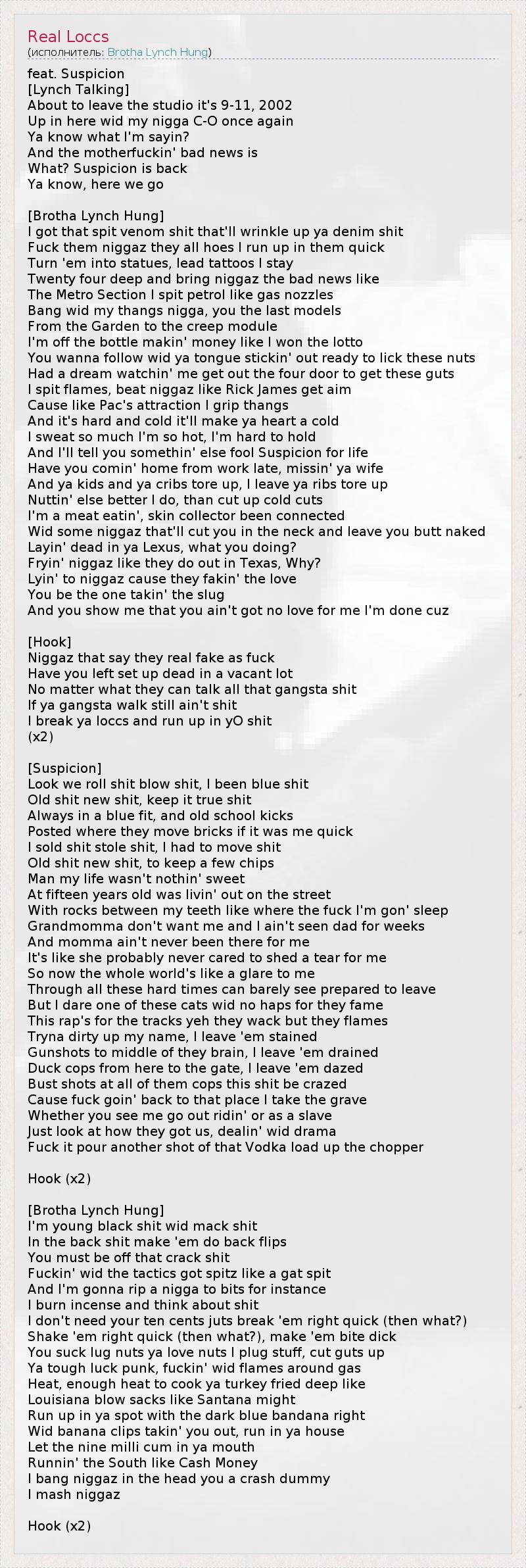 Это интересно:Brotha Lynch Hung (наст. имя Kevin Mann, родился 10 января, 1972 г.) - рэппер из города Сакраменто, штат Калифорния. Лирика Lynch'a известна тем, что она остро показывает всю тёмную сторону жизни, включая убийства, насилие банд, продажа наркотиков, изнасилования и главное людоедство. Он дебютировал своим альбомом 1993 г. "24 Deep", который очень красочно рассказывает истории связанные с тем, как он связался... продолжение