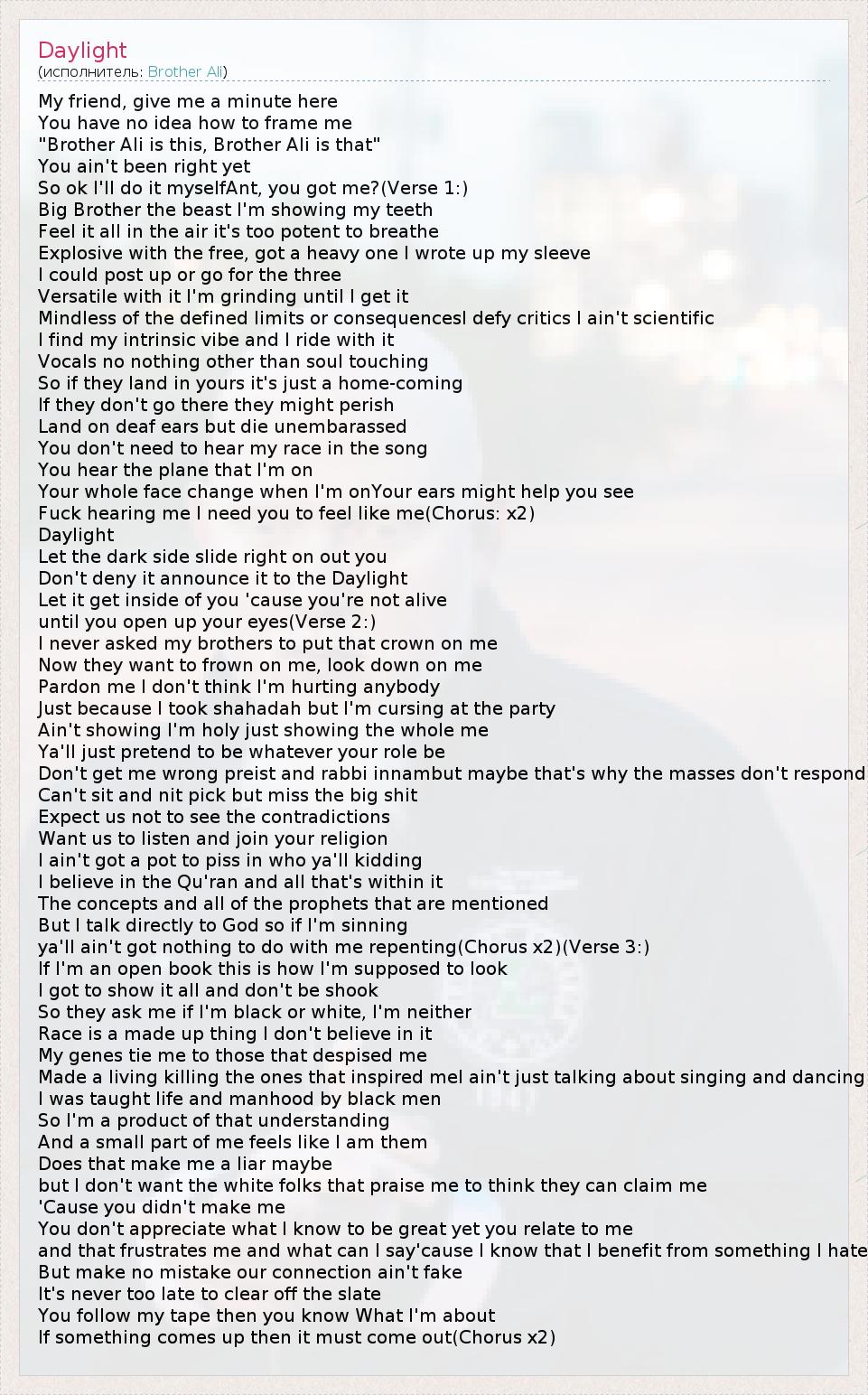 Это интересно:Ali Newman (при рождении в 1977 году получил имя Jason Newman) на сегодняшний день является одним из наиболее ярких представителей американского рэп андеграунда. Он не только делает великолепный рэп, но и наполняет его прямыми текстами, затрагивающими социальные, религиозные и политические проблемы современного мира. Свои альбомы Brother Ali выпускает на лейбле «Rhymesayers Entertainment».Родился Brother Ali в городе... продолжение