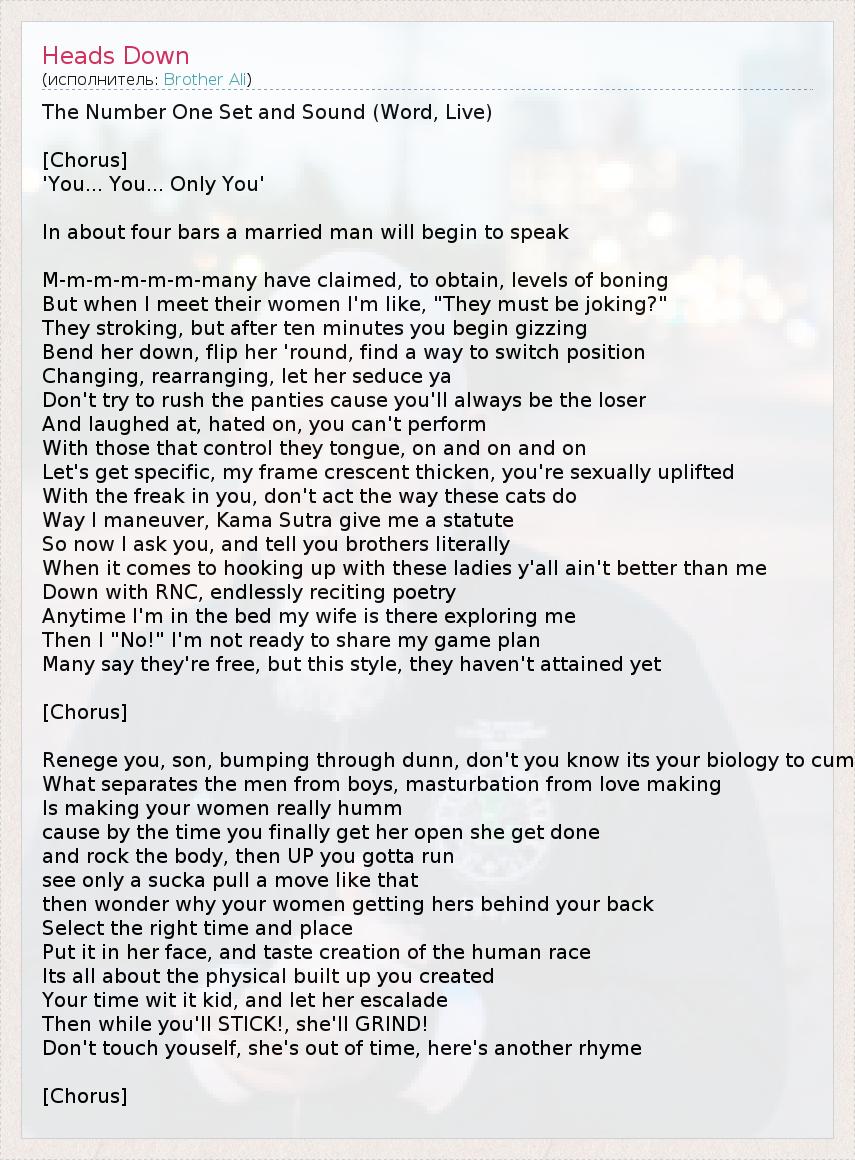 The Number One Set and Sound (Word, Live) [Chorus] 'You... You... Only You' In about four bars a married man will begin to speak M-m-m-m-m-m-many have claimed, to obtain, levels of boning But when I meet their women I'm like, "They must be joking?" They stroking, but after ten minutes you begin gizzing Bend her down, flip her 'round, find a way to switch position Changing, rearranging, let her seduce ya Don't try to rush the panties cause you'll always be the loser And laughed at, hated on, you can't perform With those that control they tongue, on and on and on Let's get specific, my frame crescent thicken, you're sexually uplifted With the freak in you, don't act the way these cats do Way I maneuver, Kama Sutra give me a statute So now I ask you, and tell you brothers literally When it comes to hooking up with these ladies y'all ain't better than me Down with RNC, endlessly reciting poetry Anytime I'm in the bed my wife is there exploring me Then I "No!" I'm not ready to share my game plan Many say they're free, but this style, they haven't attained yet [Chorus] Renege you, son, bumping through dunn, don't you know its your biology to cum What separates the men from boys, masturbation from love making Is making your women really humm cause by the time you finally get her open she get done and rock the body, then UP you gotta run see only a sucka pull a move like that then wonder why your women getting hers behind your back Select the right time and place Put it in her face, and taste creation of the human race Its all about the physical built up you created Your time wit it kid, and let her escalade Then while you'll STICK!, she'll GRIND! Don't touch youself, she's out of time, here's another rhyme [Chorus]