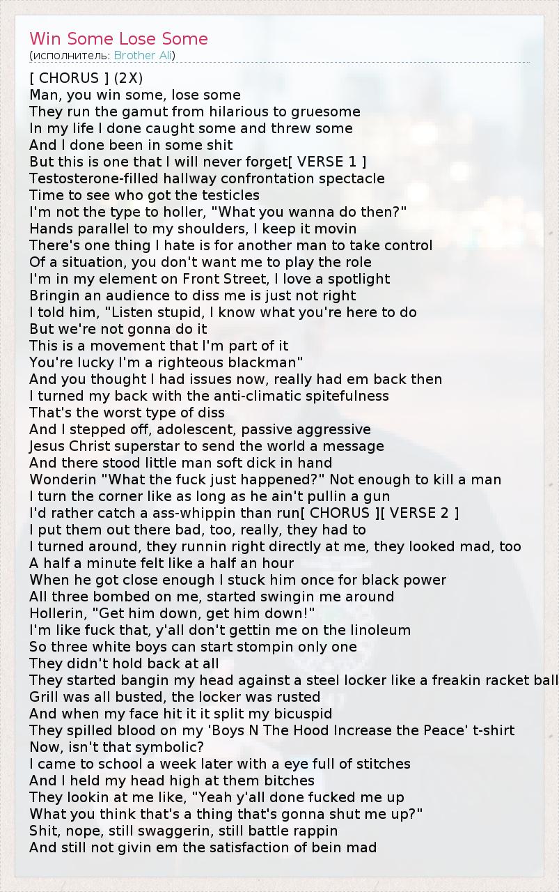 А как ты думаешь, о чем песня "Win Some Lose Some" ?