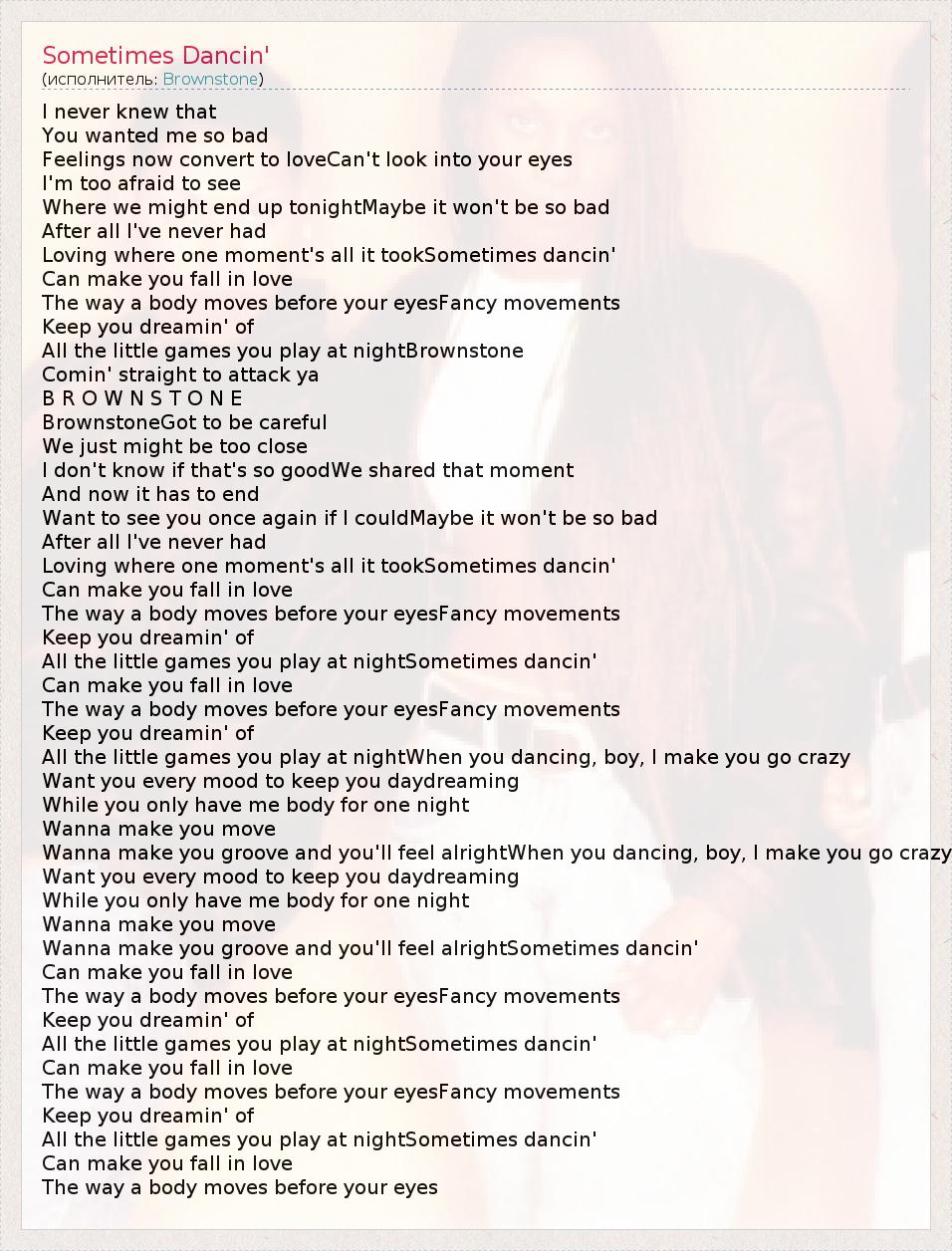 I never knew that You wanted me so bad Feelings now convert to loveCan't look into your eyes I'm too afraid to see Where we might end up tonightMaybe it won't be so bad After all I've never had Loving where one moment's all it tookSometimes dancin' Can make you fall in love The way a body moves before your eyesFancy movements Keep you dreamin' of All the little games you play at nightBrownstone Comin' straight to attack ya B R O W N S T O N E BrownstoneGot to be careful We just might be too close I don't know if that's so goodWe shared that moment And now it has to end Want to see you once again if I couldMaybe it won't be so bad After all I've never had Loving where one moment's all it tookSometimes dancin' Can make you fall in love The way a body moves before your eyesFancy movements Keep you dreamin' of All the little games you play at nightSometimes dancin' Can make you fall in love The way a body moves before your eyesFancy movements Keep you dreamin' of All the little games you play at nightWhen you dancing, boy, I make you go crazy Want you every mood to keep you daydreaming While you only have me body for one night Wanna make you move Wanna make you groove and you'll feel alrightWhen you dancing, boy, I make you go crazy Want you every mood to keep you daydreaming While you only have me body for one night Wanna make you move Wanna make you groove and you'll feel alrightSometimes dancin' Can make you fall in love The way a body moves before your eyesFancy movements Keep you dreamin' of All the little games you play at nightSometimes dancin' Can make you fall in love The way a body moves before your eyesFancy movements Keep you dreamin' of All the little games you play at nightSometimes dancin' Can make you fall in love The way a body moves before your eyes