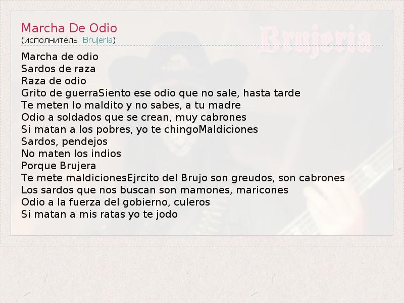 Marcha de odio Sardos de raza Raza de odio Grito de guerraSiento ese odio que no sale, hasta tarde Te meten lo maldito y no sabes, a tu madre Odio a soldados que se crean, muy cabrones Si matan a los pobres, yo te chingoMaldiciones Sardos, pendejos No maten los indios Porque Brujera Te mete maldicionesEjrcito del Brujo son greudos, son cabrones Los sardos que nos buscan son mamones, maricones Odio a la fuerza del gobierno, culeros Si matan a mis ratas yo te jodo
