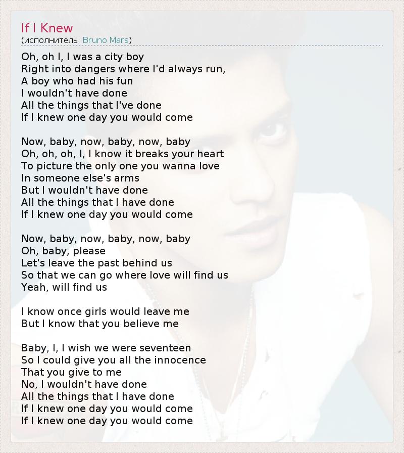 О, о, я был городским парнем И устремлялся навстречу опасностям, в которых ощущал себя как рыба в воде, Был мальчиком, получавшим удовольствие. Я бы не натворил Столько всего, Если бы знал, что однажды появишься ты. Теперь, детка, теперь, детка, теперь, детка, О, о, о, я знаю, что твоё сердце разбивается От одной мысли, как твоего возлюбленного Обнимает другая. Но я бы не натворил Столько всего, Если бы знал, что однажды появишься ты. Теперь, детка, теперь, детка, теперь, детка, О, детка, прошу, Оставим прошлое позади, Чтобы отправиться туда, где нас найдёт любовь, Да, найдёт нас. Уверен, однажды девушки ушли бы от меня, Но я знаю, что ты веришь мне. Детка, я очень хочу, чтобы нам было семнадцать, И я мог бы отдать тебе невинность, Которую ты отдала мне. Нет, я бы не натворил Столько всего, Если бы знал, что однажды появишься ты. Если бы знал, что однажды появишься ты...