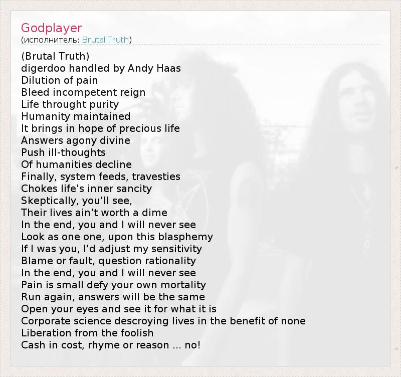 Это интересно:Brutal Truth – редкий образец "грайнда с мозгами", с собственной внутренней культурой, далёкой от потрошения зверушек или абстрактных религиозных посланий. Наверное, в случае можно говорить не о музыке, как таковой, хотя, экспериментируют музыканты в рамках грайндкора постоянно. Суть скорее состояние души и способ выплеска энергии, при уникальном сочетании нескольких различных экстремальных... продолжение